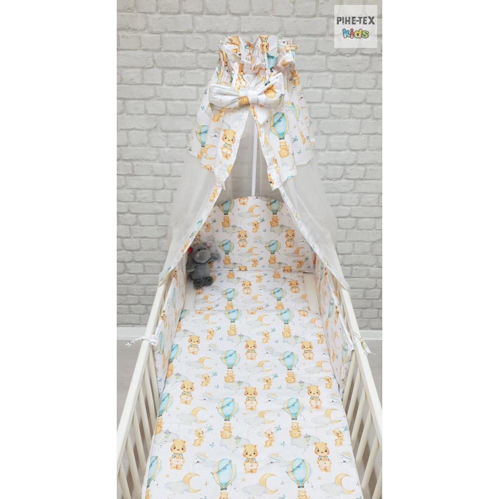 100% pamut ágynemű. A 4 részes garnitúrában paplanhuzat, párnahuzat, rácsvédő, valamint baldachin. Paplanhuzat: 90x140 cm Párnahuzat: 40x50 cm Baldachin: 180x130 cm Rácsvédő: 190x25cm Fészek: 28x68cm