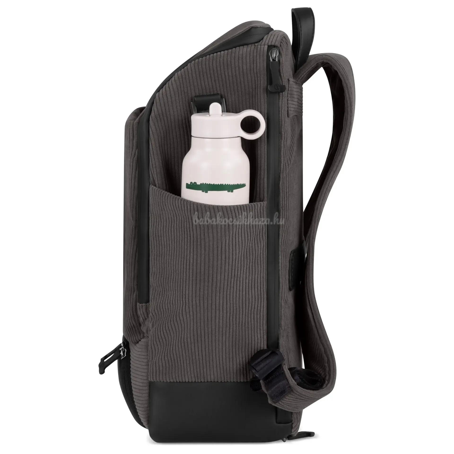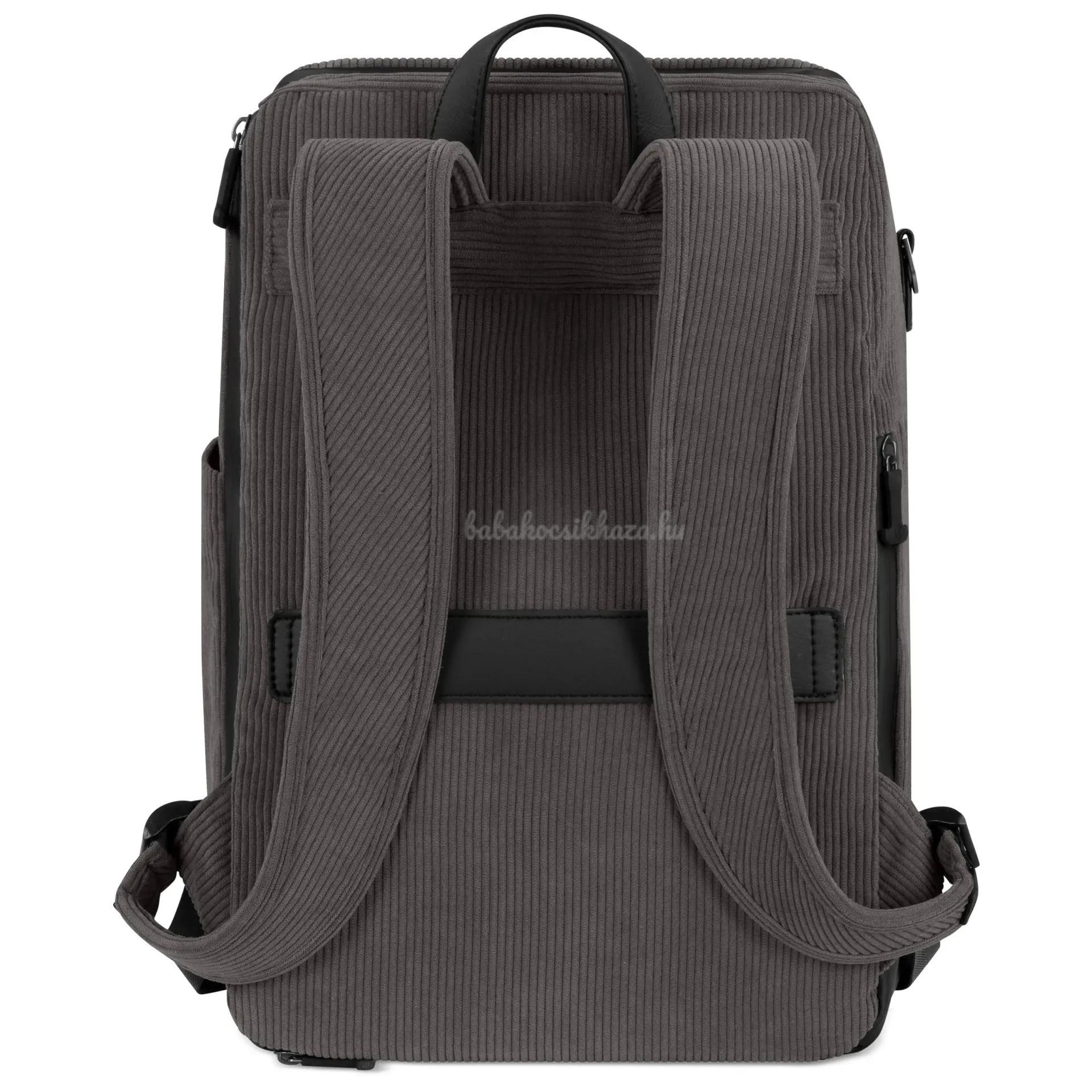 A belsejében két zseb található - köztük egy rekesz a nedves tárgyak számára. Tartalmaz továbbá egy higiénikus pelenkázó alátétet az útközbeni használathoz, egy tasakzsebet és egy termo palacktartót. A nagy, elölről nyíló főrekesz rengeteg helyet kínál - tökéletes a városi bevásárláshoz vagy egy hosszú sétához.