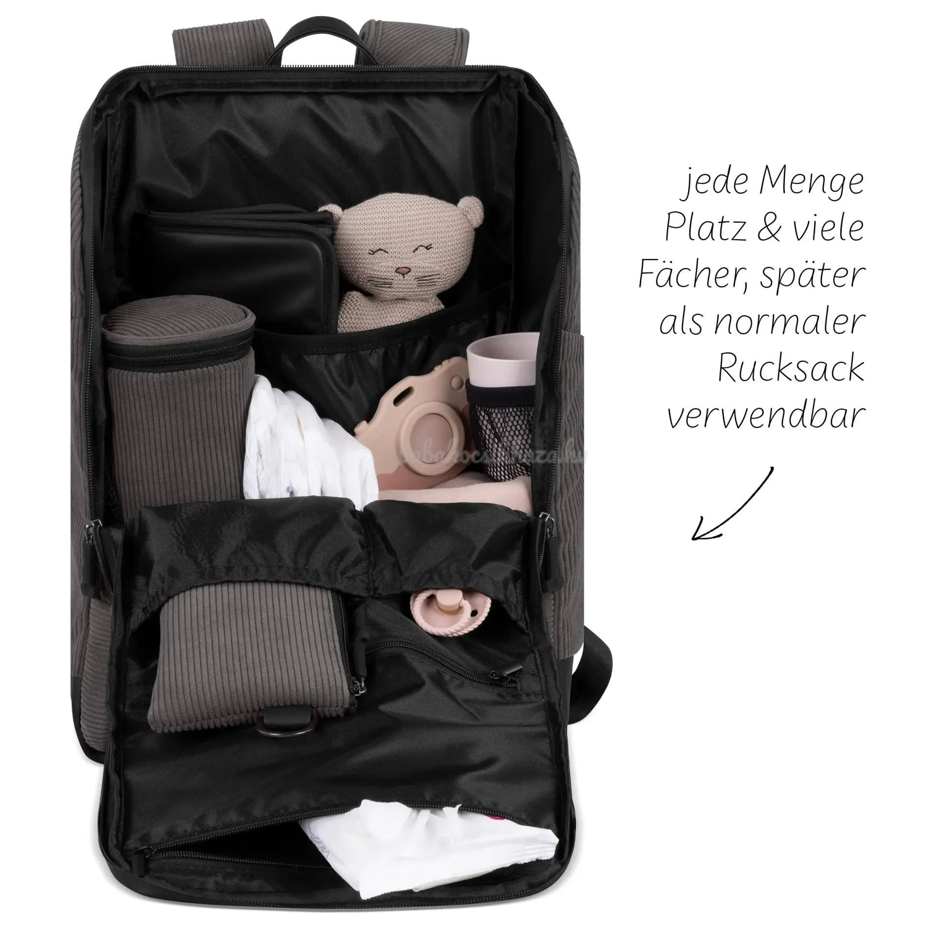 Az elülső tágas zseb mellett a pelenkázó hátizsák további hat kisebb-nagyobb oldalzsebbel van felszerelve - ideális mindenkinek, aki szereti rendben tartani a dolgait. A pelenkázó hátizsák apró cipzáras zsebekkel és praktikus rekeszekkel van ellátva, hogy egyetlen apróság se vesszen el benne.