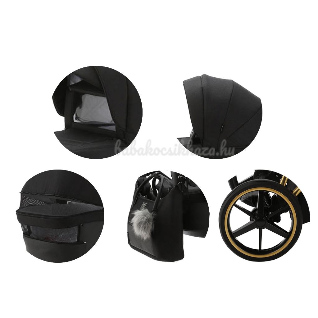 Babahordozó (fekete színben): Új típusú COSMO i-Size babahordozó 40 cm-től 87 cm-ig vagy 0-13 kg-os súlyig (kb. 1 éves korig) használható. Megújult kivehető frottír extra újszülött szűkítőbetét és deréktámasz garantálja a baba helyes pozícióját, a puha párnázás pedig növeli az utazás kényelmét. Megújult adapter segítségével egy mozdulattal rögzíthető a babakocsi vázszerkezetére és 1-1 gomb megnyomásával könnyebben levehető. Megnövelt oldal- és fejvédelem, megújult hordozófogantyúhoz kifeszíthető, könnyen állítható cipzáros kupola, 3 pontos párnázott biztonsági övrendszer központi övfeszítővel, vastag lábzsák. A 3,2 kg súlyú ülés minden nap könnyű használatot biztosít. Új típusú adapter, amivel a vázszerkezetre rögzíthető.