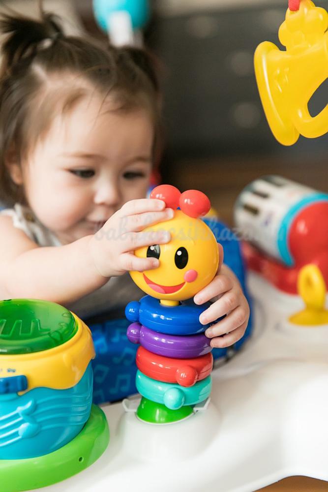 Engedje, hogy a zene legyen gyermeke múzsája és változtassa őt kis művésszé. A kicsi kezek kopogtatással az elektronikus bongo dobokon aktiválhatják a fényeket, hangokat és több nyelvet. A gyermek forgathatja a henger alakú zongorát és meglepő hangokat adhat ki vagy gitározhat és táncra perdítheti a színes gyöngyöket. A biztonságos tükör a tamburinnal támogatja a gyermek önismeretét. Ez az egyedülálló gyermek ugráló 360°-ban forog, így a kis zenész átléphet az egyes tevékenységek között és a szórakozás soha nem ér véget, mert folyamatosan új tevékenységeket fedez fel.