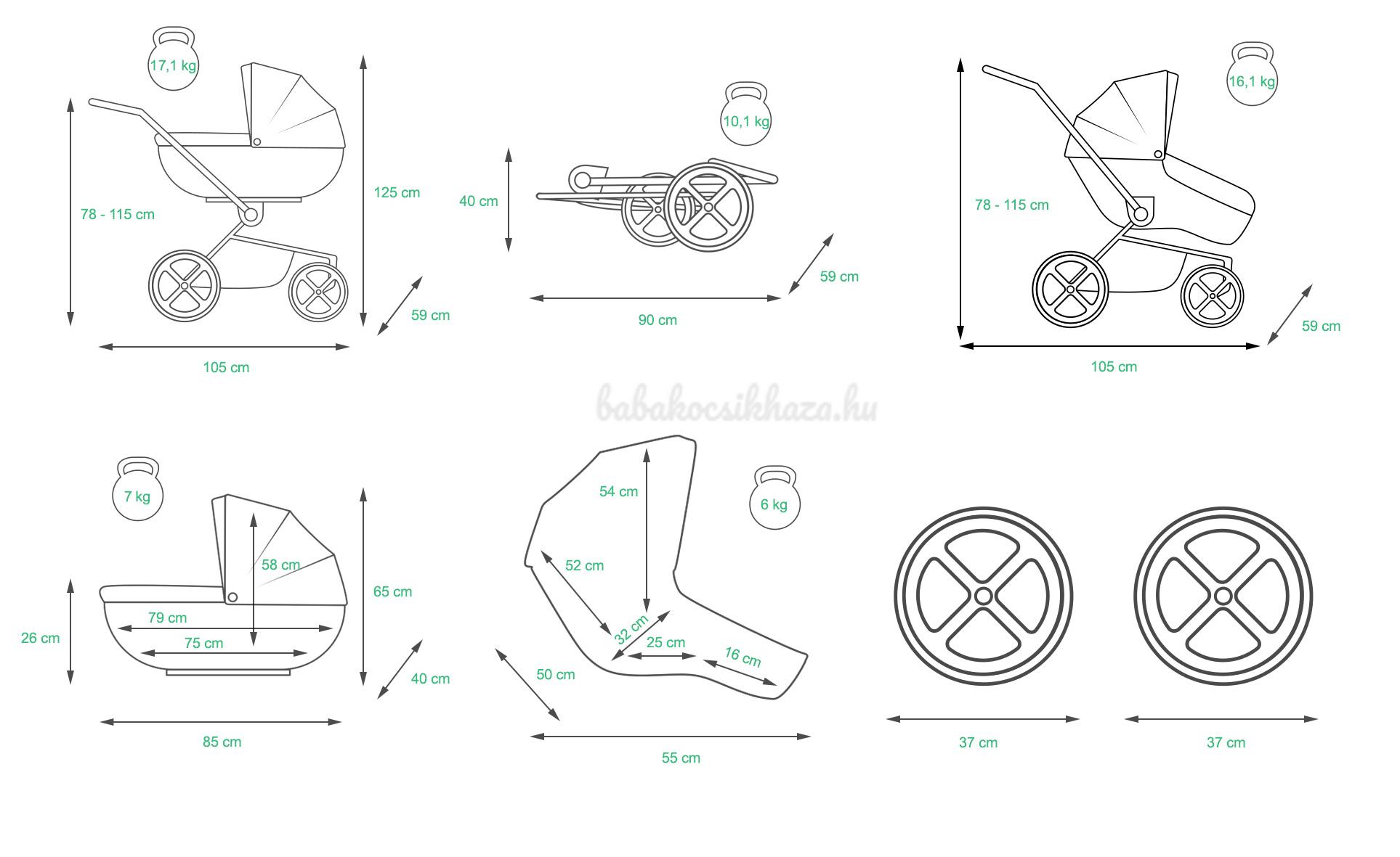 A babakocsi kerekekkel együtt: 105 x 59 x 125 cm