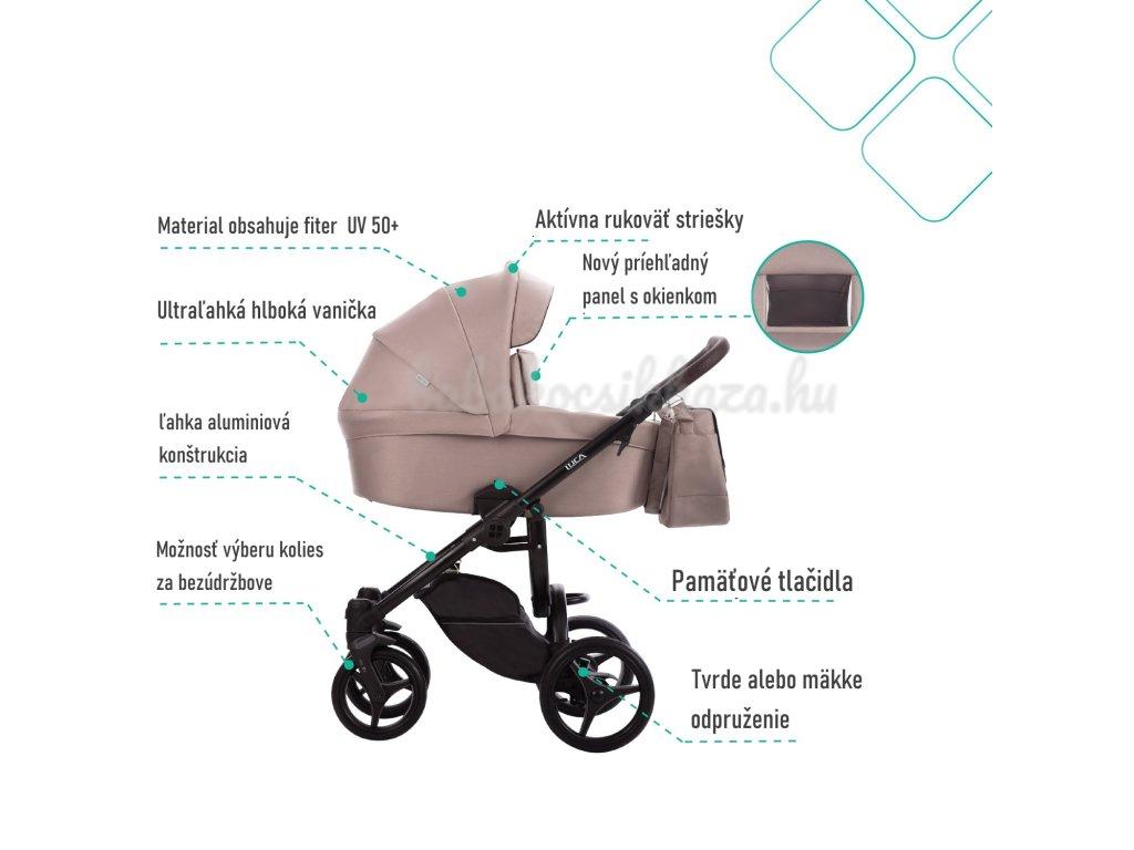 - Nagy méretű szúnyoghálós kémlelő-szellőző nyílás, bővíthető méretű kupolával, behajtható napellenzővel. A kupola hátsó része lecipzározható, így nyáron a kupola védelmet nyújt babádnak a napsütés ellen, mégis átszellőzik a levegő a kupola alatt