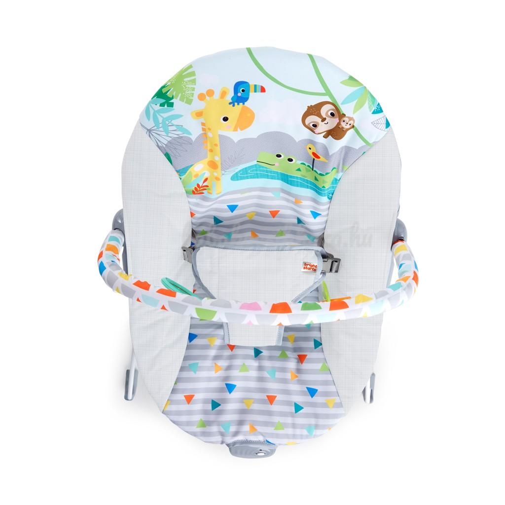 Szórakozás teljes gőzzel! A Bright Starts márkájú Safari Fun™ pihenőszék egyedülálló helyet biztosít a pihenésre és játékra a bájos interaktív játékokkal. A lágy és kényelmes szövetek vidám mintákkal biztosítják, hogy a baba kényelmesen és nyugodtan érezze magát. Az eltávolítható játékhíd gyors hozzáférést biztosít a babához. A megnyugtató rezgések segítenek a babát boldogan és elégedetten tartani. A pihenőszék egyszerűen összeszerelhető, nem szükséges hozzá semmilyen szerszám. Tartalmaz egy 3-pontos állítható biztonsági övet és csúszásgátló lábakat. Az ülőrész könnyen tisztán tartható, mosógépben mosható.
