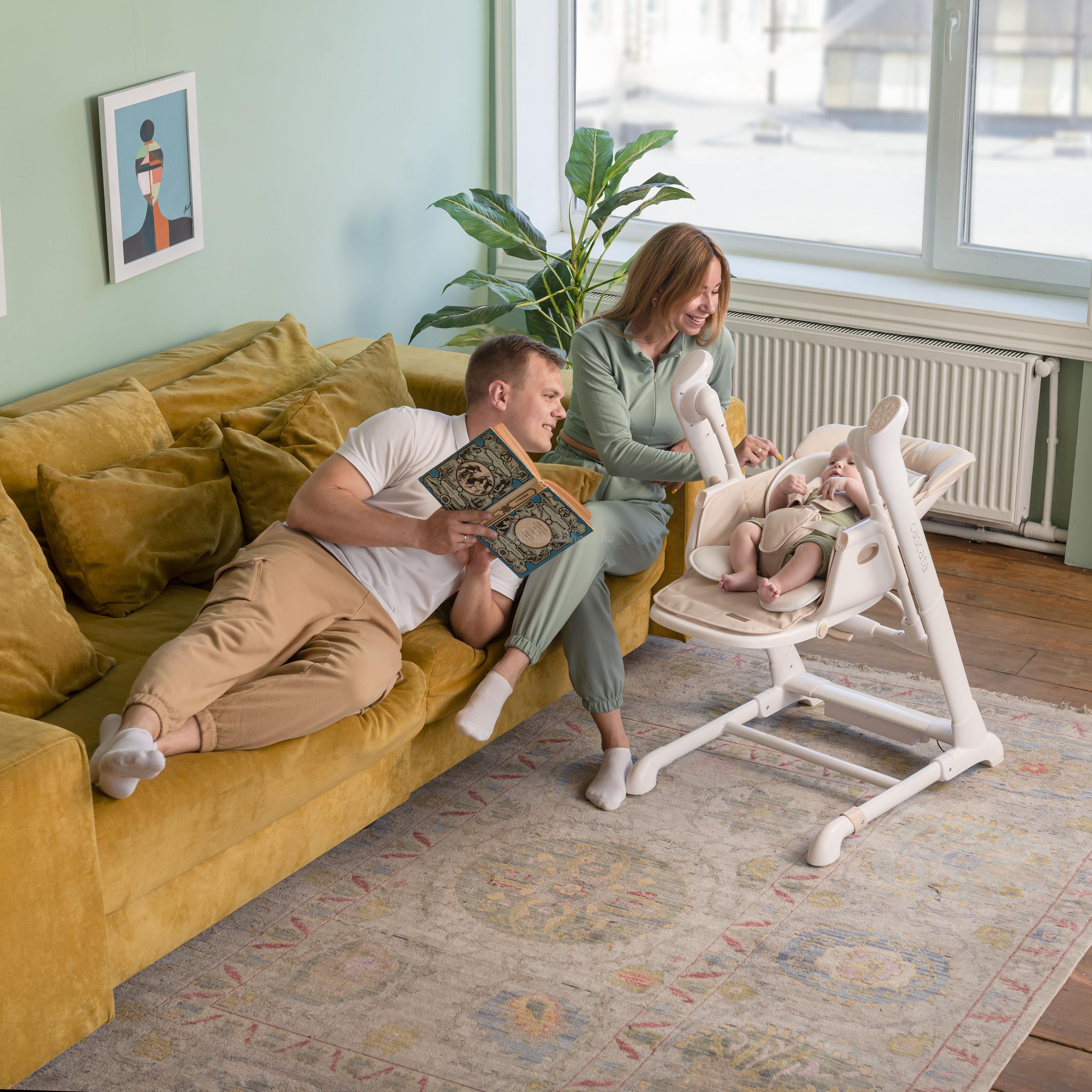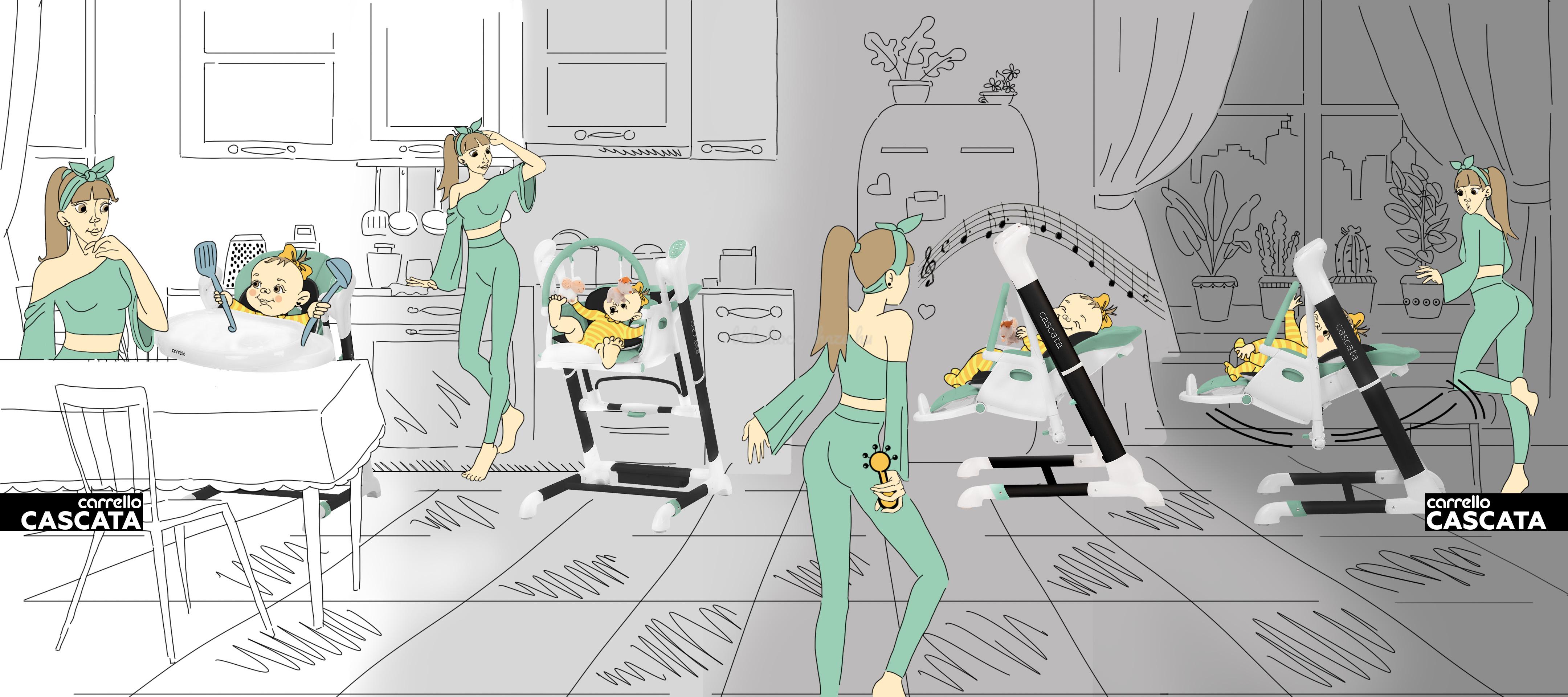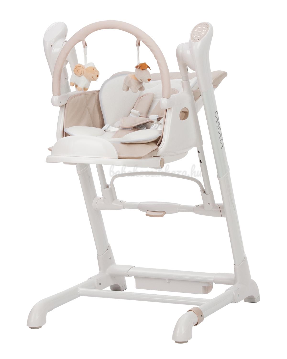 A Cascata egy többfunkciós szék, amely egyesíti a nyugágy, a hinta és az etetőszék funkcióit.
