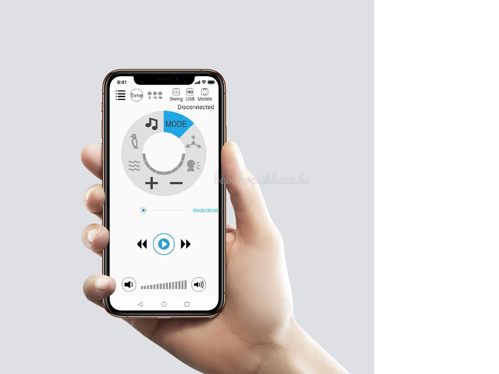 A szülők kényelmét szolgálja a telefonról történő távirányító is, mozgásérzékelő funkcióval is rendelkezik, amely mérsékelt zenei hangerő mellett automatikusan aktiválja a lassú ringató módot.