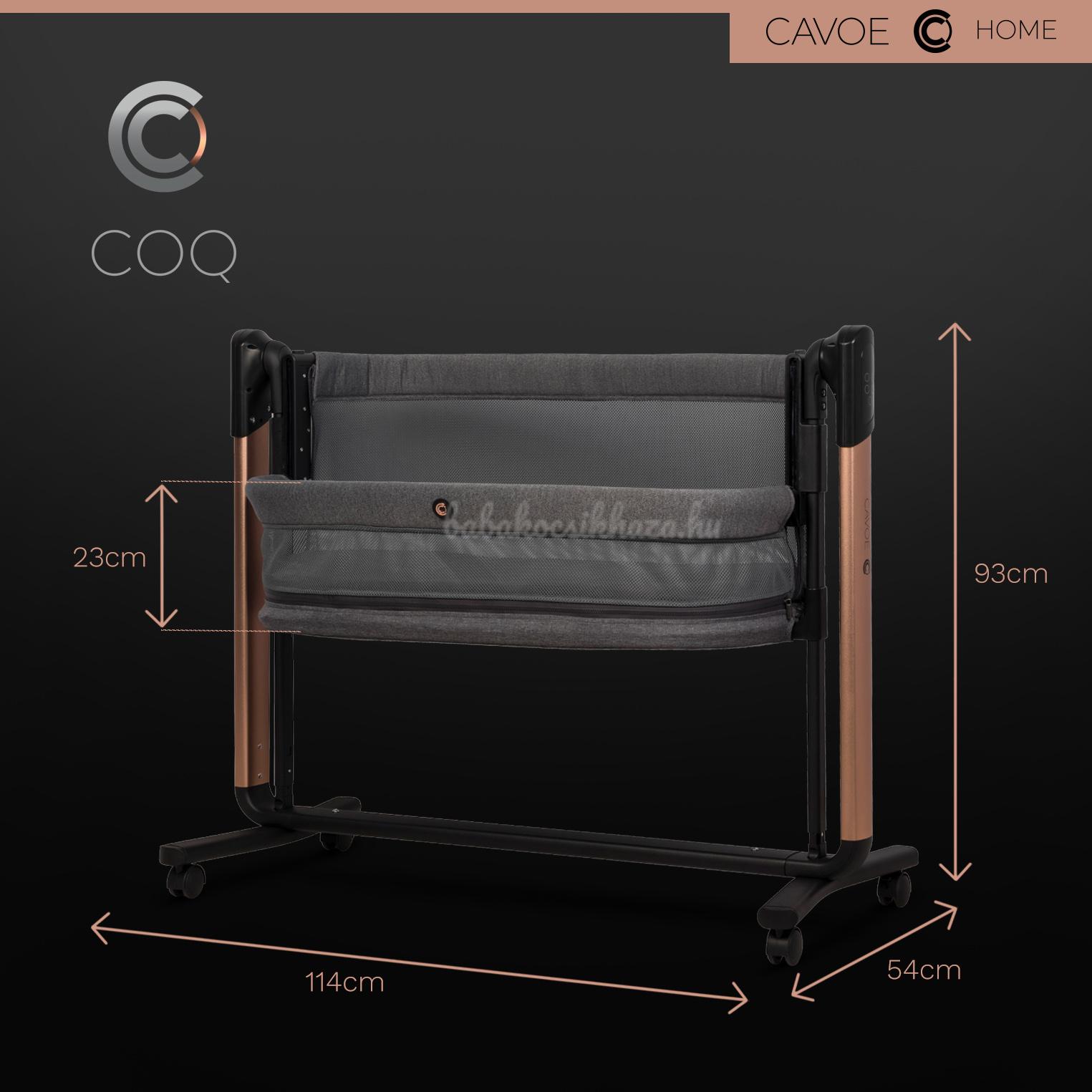 A CAVOE HOME egy otthonában használható gyermektermékekből álló sorozat. Ez a rendkívül elegáns kollekció a CAVOE márka jellegzetes stílusában készült termékeket tartalmaz. A mélyfekete és a kiváló minőségű anyagok, amelyeket diszkréten rózsaarany fém kiegészítőkkel díszítettek, azonban csak kiegészítik a CAVOE HOME sorozat fő erősségét, az innovációt és a funkcionalitást. A CAVOE HOME sorozat megalkotásakor a tervezők figyelembe vették gyermeke és az Ön kényelmét is. A merész dizájn szakít az elfogadott szabványokkal, és mélyfeketét vezet be a gyermektermékekbe. A CAVOE HOME sorozat termékei nem csak a gyerekszobában, hanem otthona különböző helyiségeiben is használhatóak. Tökéletesen illeszkednek a modern loft stílusú belső terekbe, legyen szó étkezőről, nappaliról vagy hálószobáról. A CAVOE COQ egy innovatív multifunkcionális termék, amely a funkcionális tulajdonságokat a legmodernebb technológiával ötvözi. A COQ egyesíti egy elektromos bölcső és egy multifunkcionális 3 az 1-ben kiságy funkcióit. Lehet normál hordozóágy, extra kiságy (kiságyhosszabbítás) és járóka egy nagyobb gyermek számára. Ez tehát egy 4 az 1-ben SMART termék. A CAVOE tervezői a merész stílusra és a modern termékformára összpontosítanak, így a COQ nemcsak használati funkcióval rendelkezik, hanem otthonának dísze is lehet. INDUKCIÓS FUNKCIÓ - A COQ nem egy átlagos elektromos bölcső. Intelligens indukciós funkcióval rendelkezik, amely automatikusan érzékeli, ha a baba elalszik. A bölcső automatikusan szünetelteti a ringatást, és amikor a baba újra felébred és mozogni kezd, a ringatás automatikusan folytatódik. Az indukciós funkciónak köszönhetően Ön és a baba is kipihent lesz. 5 ringatási sebesség - a bölcső kézi folyamatos üzemmódban 5 sebesség közül választhat. Minden babának más a dinamikája, és néha egy kicsit dinamikusabb hintázásra van szükség. Ráadásul a magasság változtatásával a hintatartomány is változik. A bölcső leengedése növeli a hintatartományt, emelése pedig csökkenti a hintatartományt. A hintázási időBEÁLLÍTÁSA - a COQ hintázási időprogramozónak köszönhetően 3 hintázási időszak közül egyet állíthat be: 8, 15 vagy 30 perc. Természetesen a COQ bölcső folyamatosan is működhet, amíg ki nem kapcsolja. VÁLASZTHAT MELÓDIÁT - a COQ elektromos bölcső több kellemes, pihentető dallam közül választhat, amelyek biztosan segítenek elaludni a babának. A dallamhoz a megfelelő hangerőt is beállíthatja. BLUETOOTH KIJELZŐ - a Bluetooth hangszóró funkciónak köszönhetően csatlakoztathatja mobiltelefonját a COQ bölcsőhöz, és bármilyen zenét bekapcsolhat. A telefonjáról lejátszási listákat állíthat be és beállíthatja a hangerőt. PILOT - a vezérlőpanel érintéssel vagy az intuitív távirányítóval is kezelhető, így nem kell minden alkalommal a bölcsőhöz sétálnia, és nem kell kockáztatnia, hogy akaratlanul felébreszti a babát.