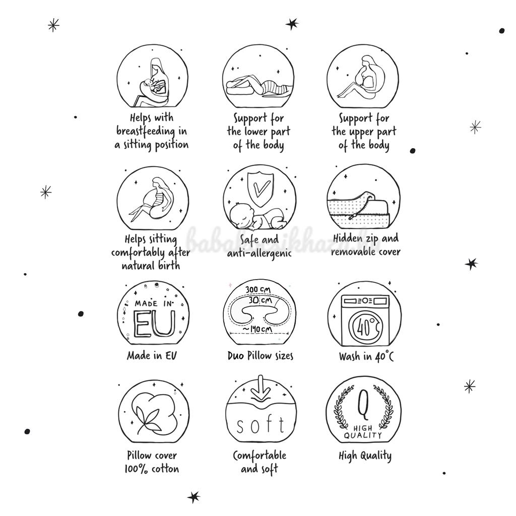 Ne használja a párnát kiságy vagy autósülés helyettesítésére: a párna nem alvóhely vagy szállítóeszköz a gyermek számára. Soha ne helyezze a gyermeket a párnára éjszaka, és ne használja autósülésben. A gyermeket mindig biztonságos, megfelelő körülmények között kell elhelyezni, mint például kiságy vagy autósülés, a gyártó ajánlása szerint.