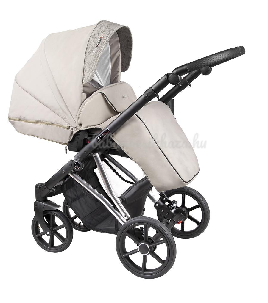 Multifunkcionális babakocsi alumínium szerkezeten, a legújabb trendeknek megfelelően. Különös figyelmet fordítanak a gondola steppelt lábvédőjére, divatos, geometrikus mintával. A kényelmes és tágas babakocsi előre vagy hátrafelé szerelhető. A babakocsi felfüggesztése alkalmazkodik az egyenetlen terephez és a vezetési kényelemhez.