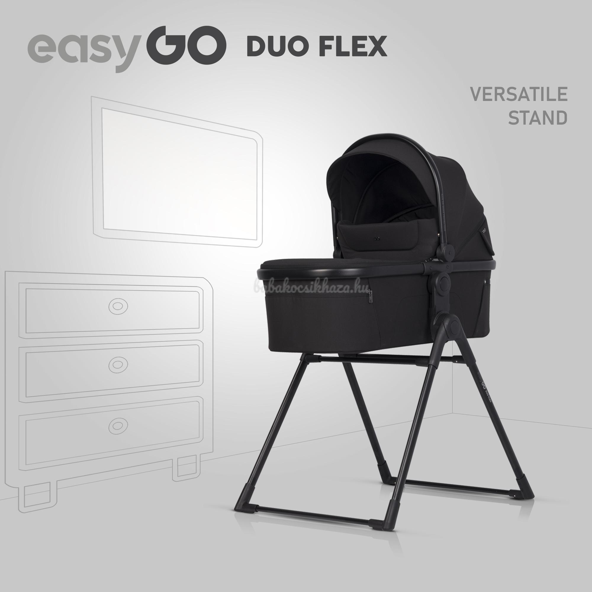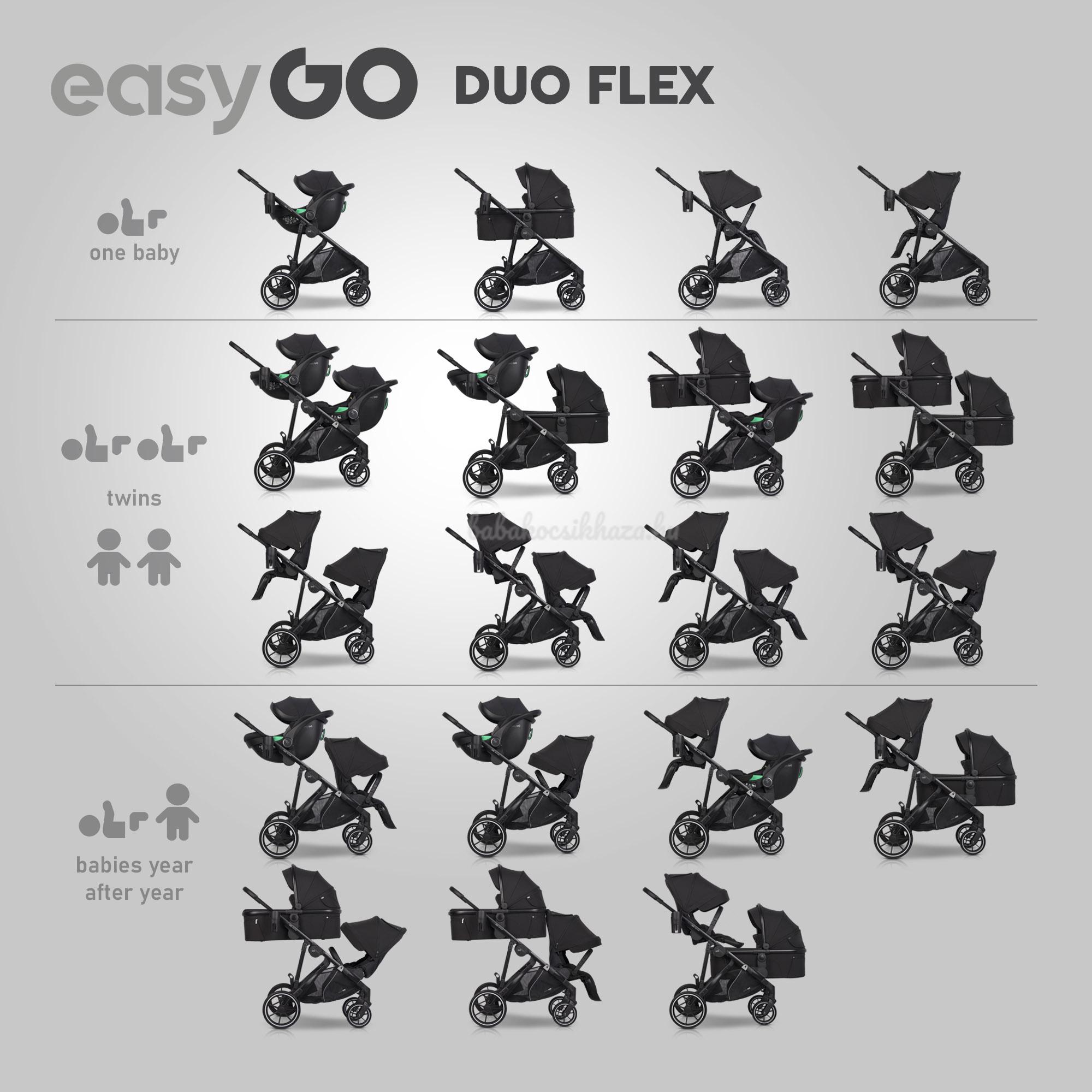 Tapasztalatunk egyre jobb babakocsik megalkotásában nyilvánul meg az Ön gyermekei számára. Egy jó babakocsi megtervezése két gyermek számára nem könnyű feladat, hiszen össze kell egyeztetni a gyermekek kényelmét a babakocsi méreteivel és súlyával, hogy a babakocsi kényelmesen vezethető legyen és beférjen egy szabványos ajtónyíláson otthon, a boltban vagy a liftben. Így született meg az EASYGO Duoflex babakocsi - a gyermekek és a szülők kényelmét ötvözve. A Duoflex egy ikerbabakocsi, de a mózesek megvásárlásával 2 az 1-ben szetté vagy egy sportülés és egy mózes kombinációjává alakítható.