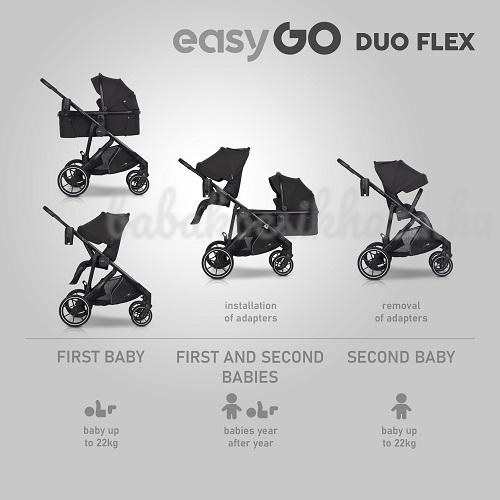 Tapasztalatunk egyre jobb babakocsik megalkotásában nyilvánul meg az Ön gyermekei számára. Egy jó babakocsi megtervezése a gyermek számára nem könnyű feladat, hiszen össze kell egyeztetni a gyermekek kényelmét a babakocsi méreteivel és súlyával, hogy a babakocsi kényelmesen vezethető legyen és beférjen egy szabványos ajtónyíláson otthon, a boltban vagy a liftben. Így született meg az EASYGO Duoflex sportbabakocsi - a gyermekek és a szülők kényelmét ötvözve. A Duoflex egy sportbabakocsi, de a mózes megvásárlásával 2 az 1-ben szetté alakítható.
