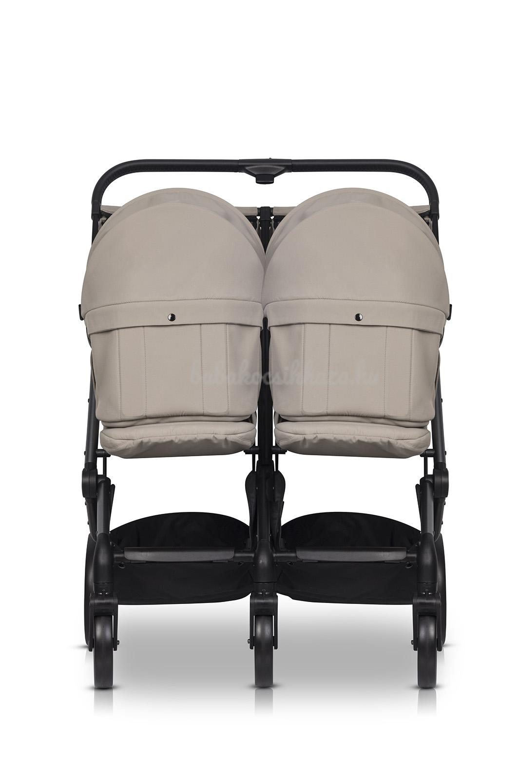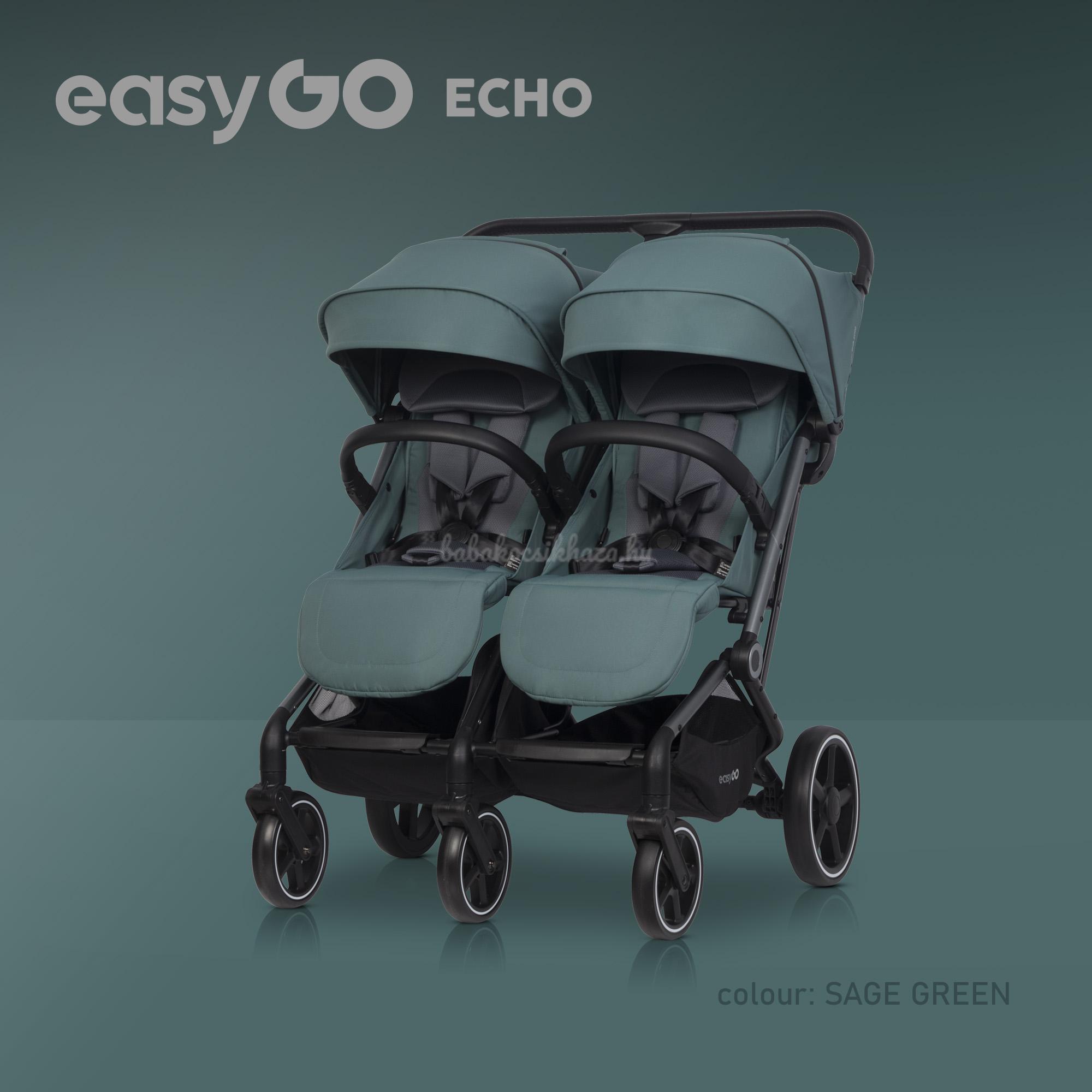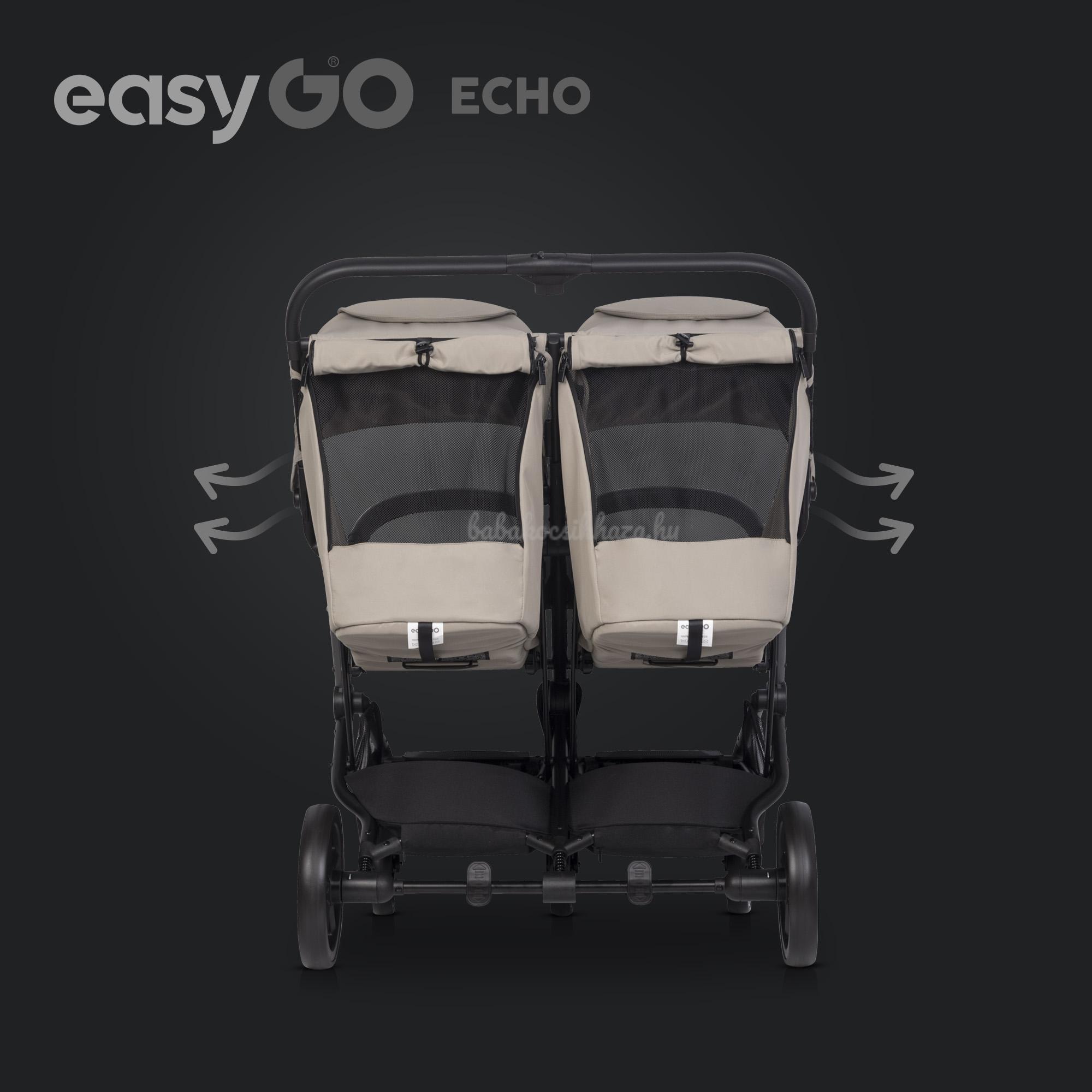 Az EASYGO márka több mint 15 éve évről évre az ikrek számára készült babakocsik vezető gyártója. Tapasztalatunk egyre jobb babakocsik megalkotásában nyilvánul meg az Ön gyermekei számára. Egy jó babakocsi megtervezése két gyermek számára nem könnyű feladat, hiszen össze kell egyeztetni a gyermekek kényelmét a babakocsi méreteivel és súlyával, hogy a babakocsi kényelmesen vezethető legyen és beférjen egy szabványos ajtónyíláson otthon, a boltban vagy a liftben. Így született meg az EASYGO ECHO babakocsi - a gyermekek és a szülők kényelmét ötvözve. Az ECHO egy ikerbabakocsi, de a puha mózesek megvásárlásával 2 az 1-ben szetté vagy egy sportülés és egy mózes kombinációjává alakítható. Újszülöttkortól egészen 22 kg-ig lehet használni(44 kg). A puha mózes közvetlenül a fekvő ülésre van felszerelve. A levehető napellenzőnek köszönhetően a mózes felszerelése után a szülő a babakocsi vezetése tolása közben is láthatja a gyermeket. Az ECHO könnyű kezelhetősége miatt jobban kezelhető, mint a legtöbb egyszemélyes babakocsi. Ez annak köszönhető, hogy a babakocsi ideális egyensúlya biztosítja, hogy az első kerekek megfelelő súlyt kapnak, és a babakocsi könnyen hátrafelé billenhet, amikor a járdaszegélyre hajt. A babakocsi hátsó tengelyén lévő 3 lengéscsillapítóból és az első kerékből álló innovatív rendszer lehetővé teszi a kényelmes vezetést különböző felületeken. A hátsó rugókat speciális keményítési eljárásnak vetették alá, hogy hosszabb ideig rugalmasak maradjanak, még 44 kg-os maximális terhelés esetén is. Az ECHO iker babakocsi rendkívül alacsony súlyának köszönhetően a piacon kapható legkönnyebb két gyermek számára készült babakocsi ebben a méretben. Az ECHO a sportüléses változatban mindössze 12,90 kg-ot nyom. Ezt az alacsony súlyt a babakocsi vázának fő elemeihez használt speciális alumíniumötvözetnek köszönhetően érte el. A DUAL FOLD összecsukási rendszernek (két összecsukási pont) köszönhetően az ECHO egy kis kocka méretűre hajtható össze, bár kibontva egy nagy, kényelmes babakocsi. Fontos, hogy az összecsukható rendszer egy kézzel működtethető, és a babakocsi összecsukott állapotban magától áll. A kárpitozott részek nem érnek a talajhoz, így véletlenül sem szennyeződnek be. A babakocsi automatikus zárómechanizmussal is rendelkezik, így összecsukott állapotban is kényelmesen szállítható. A két egymás mellett utazó gyermek számára készült babakocsik gyakori hátránya, hogy túl szélesek, így nem lehet átjutni az ajtókon. Az ECHO esetében ez a probléma nem áll fenn. A babakocsi vázát úgy alakították ki, hogy a hátsó kerekek ne nyúljanak túl az ülés vonalán, így a babakocsi szélessége mindössze 78 cm. A babakocsihoz mellékelve kap egy szellőzőnyílásokkal ellátott esővédőt, amely a babakocsi teljes kárpitját lefedi, valamint 2 meleg lábzsákot is.