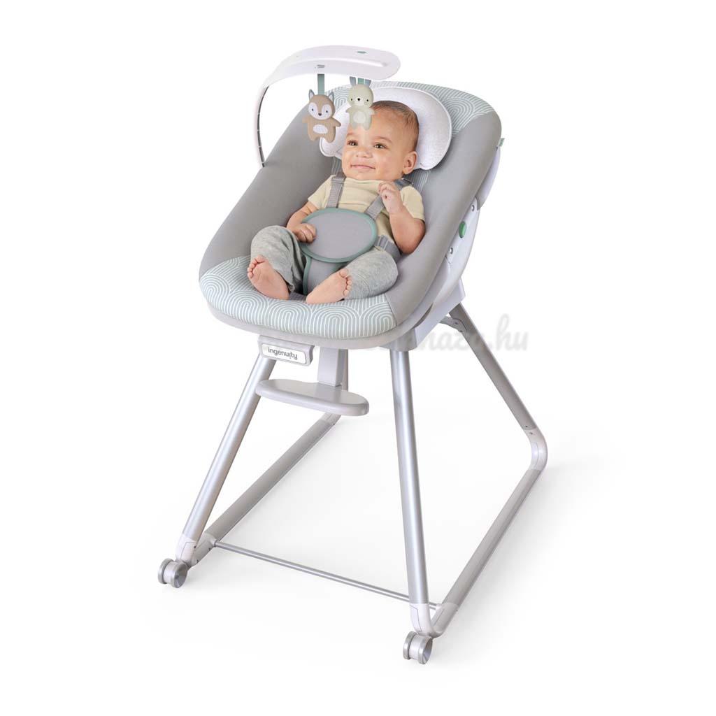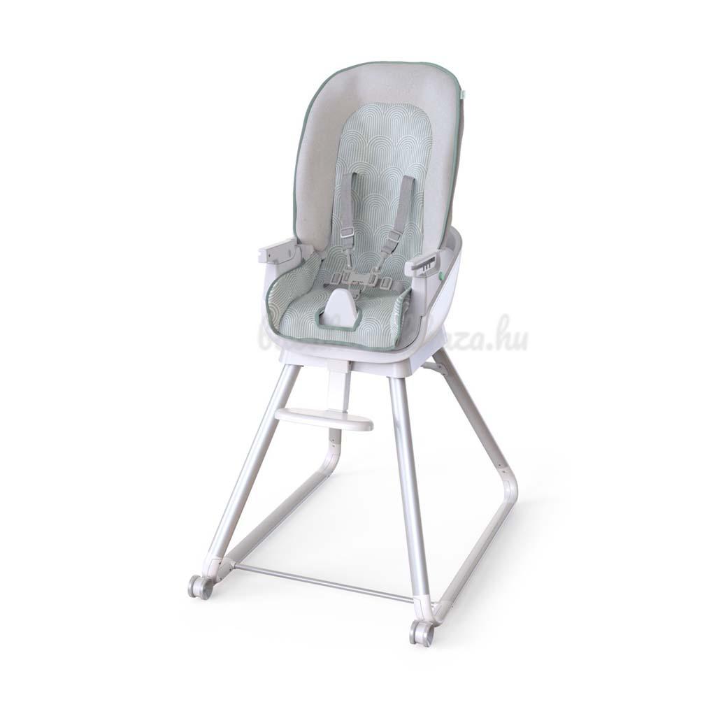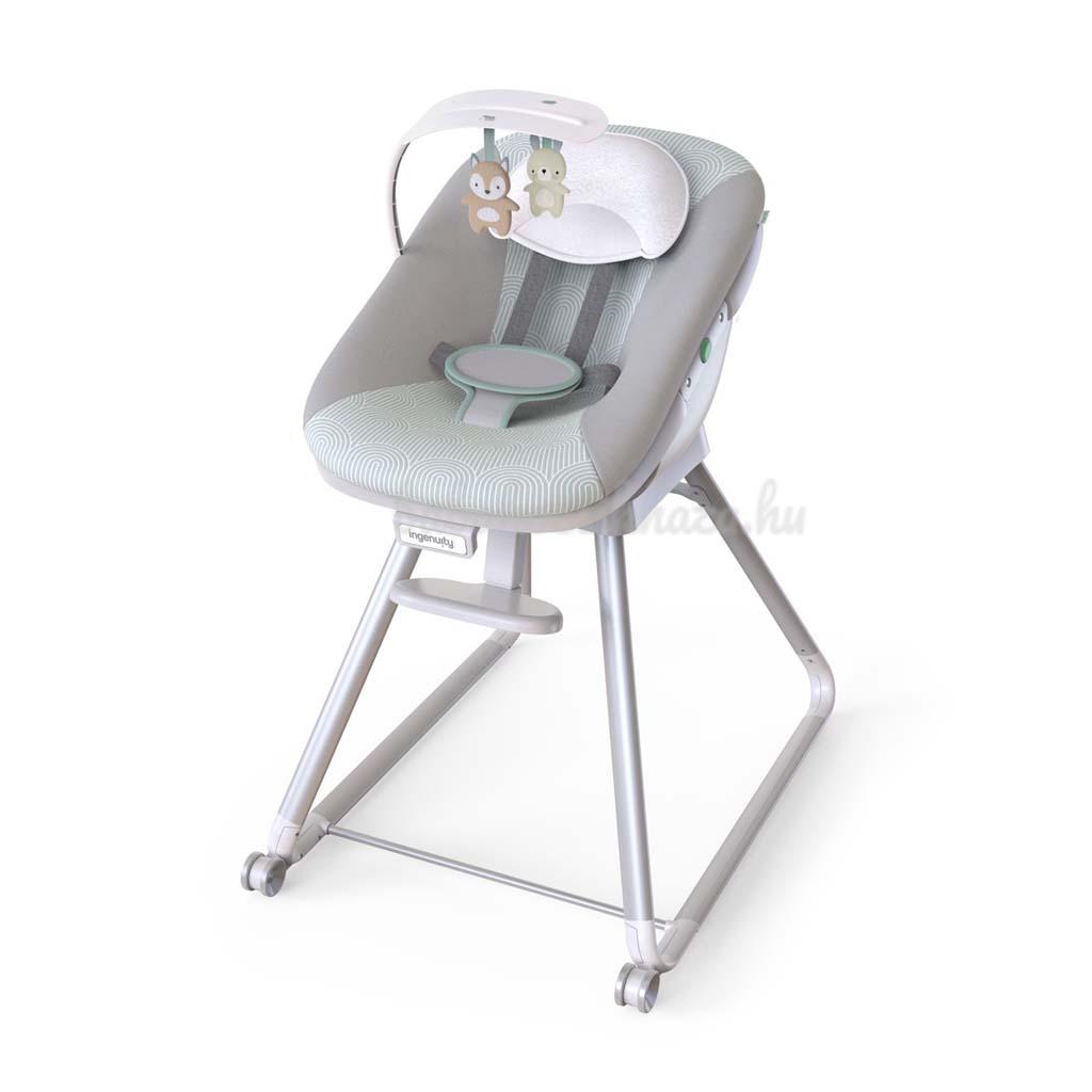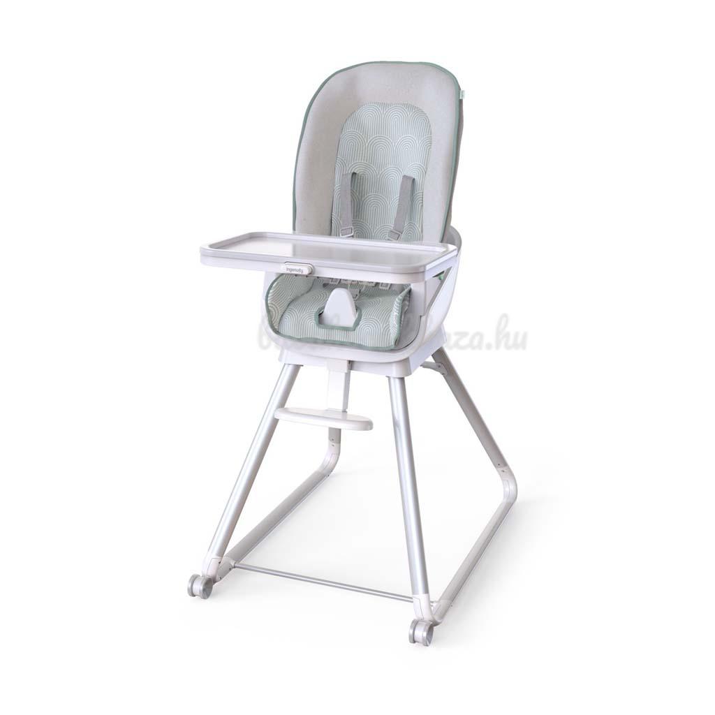Az Ingenuity legsokoldalúbban átalakítható 6in1 etetőszék lehetőséget ad arra, hogy gyermeke az első naptól kezdve Ön mellett lehessen. Az Ingenuity Beanstalk™ 6in1 etetőszék 6 módot kínál újszülött kortól 5 éves korig tartó használathoz. Ezek: az újszülöttek számára 9 kg-ig tervezett, gyengéd rezgéssel ellátott, pihenőszék játékhíddal; egy teljes méretű etetőszék tálcával; egy gyermek étkezőszék, amely lehetővé teszi, hogy a baba tálca nélkül is csatlakozhasson a családhoz az asztalnál; egy párnázott etetőszék, amely a hagyományos étkezőszékhez rögzíthető; egy kisgyermek etetőszék; és az etetőszék 2 különálló részre osztható, hogy két gyermek egyszerre ülhessen. Az extra kényelmes ülőke párnázat kényelmes helyet teremt az etetéshez. A szék két elülső görgővel rendelkezik a könnyebb mozgatás érdekében, és így egy kézzel is könnyen manőverezhető. Az étkezőpult levehető, és az ülést 3 különböző pozícióba állíthatja a legmegfelelőbb dőlésszögbe, hogy a baba biztonságban és kényelemben legyen. Az állítható 5 pontos biztonsági heveder minden módban a székben tartja a babát. A csecsemő pihenőszék módban játékokkal és nyugtató rezgésekkel ellátott játékhíd található, amely szórakoztatja a babát, amíg Ön főz. Ahogy a baba növekszik, a lábtartó többféle magassági beállítással igazodik a baba magasságához. Az étkezés közbeni szennyeződések többé nem jelentenek problémát – a letörölhető ülésbetét és a mosogatógépben mosható, BPA-mentes tálcának köszönhetően a Beanstalk pillanatok alatt rendezett és tiszta lesz.