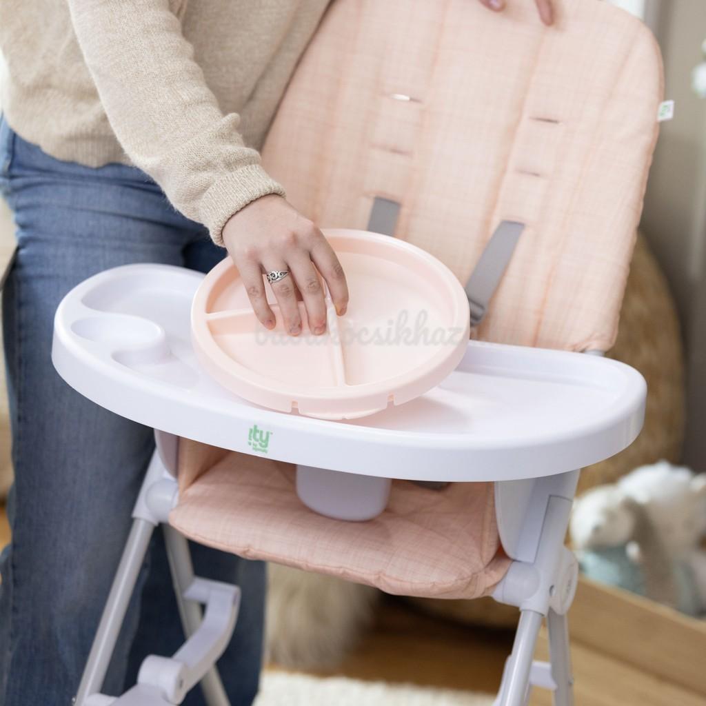 Ez az egyetlen magas szék, amely támogatja a gyermek önálló etetési képességeit egy tányérral. Az egyedülálló 3 részes Twist & Dine tányér biztonságosan zárható a helyére, hogy a kisgyermekek ne dobálhassák a földre, és mikrohullámú sütőben is használható az egyszerű ételkészítés érdekében. Ahogy a gyermek nő, a nagy étkezőtálca 3 pozícióba állítható. A tároláskor a tálca a szék támlájához rögzíthető. Az ülőpárna mosógépben mosható. Az 5 pontos biztonsági öv a gyermek biztonságát garantálja.