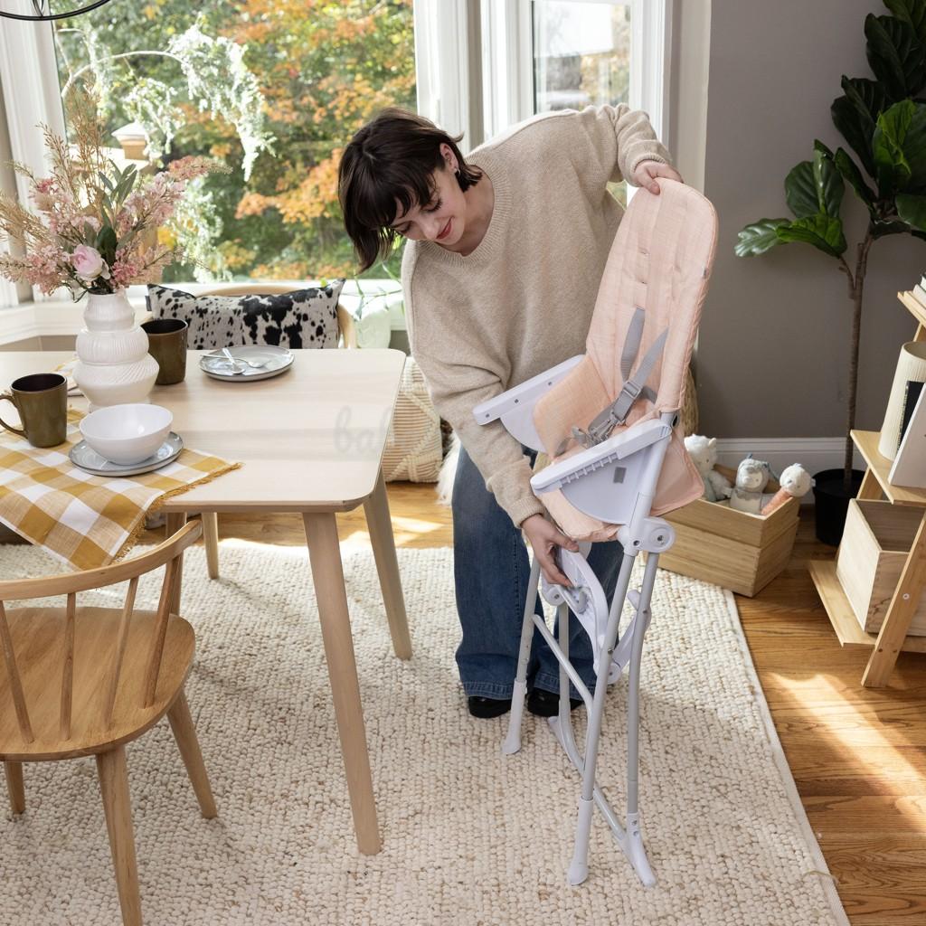 - A gyermek magas székének könnyű kialakítása lehetővé teszi az egyszerű mozgathatóságot a házban. A karcsú szék összecsukva magától áll és laposra csukható a tárolás érdekében.