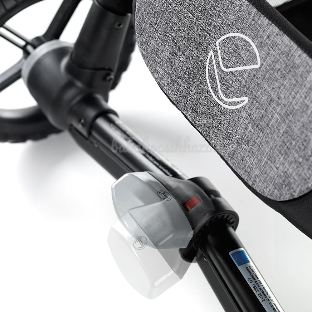 A strapabírást még inkább fokozza a lengéscsillapítós rugózás, amivel a nehezebb terepen is kényelmesen közlekedhetünk. A váz hátulja fordított C-rendszerű, hogy a szülők felé fordítva elég hely legyen a kicsi lábainak. Az első kerekek bolygósítását színes jelzések segítik. A piros fixált, a zöld bolygósított állapotot jelez.