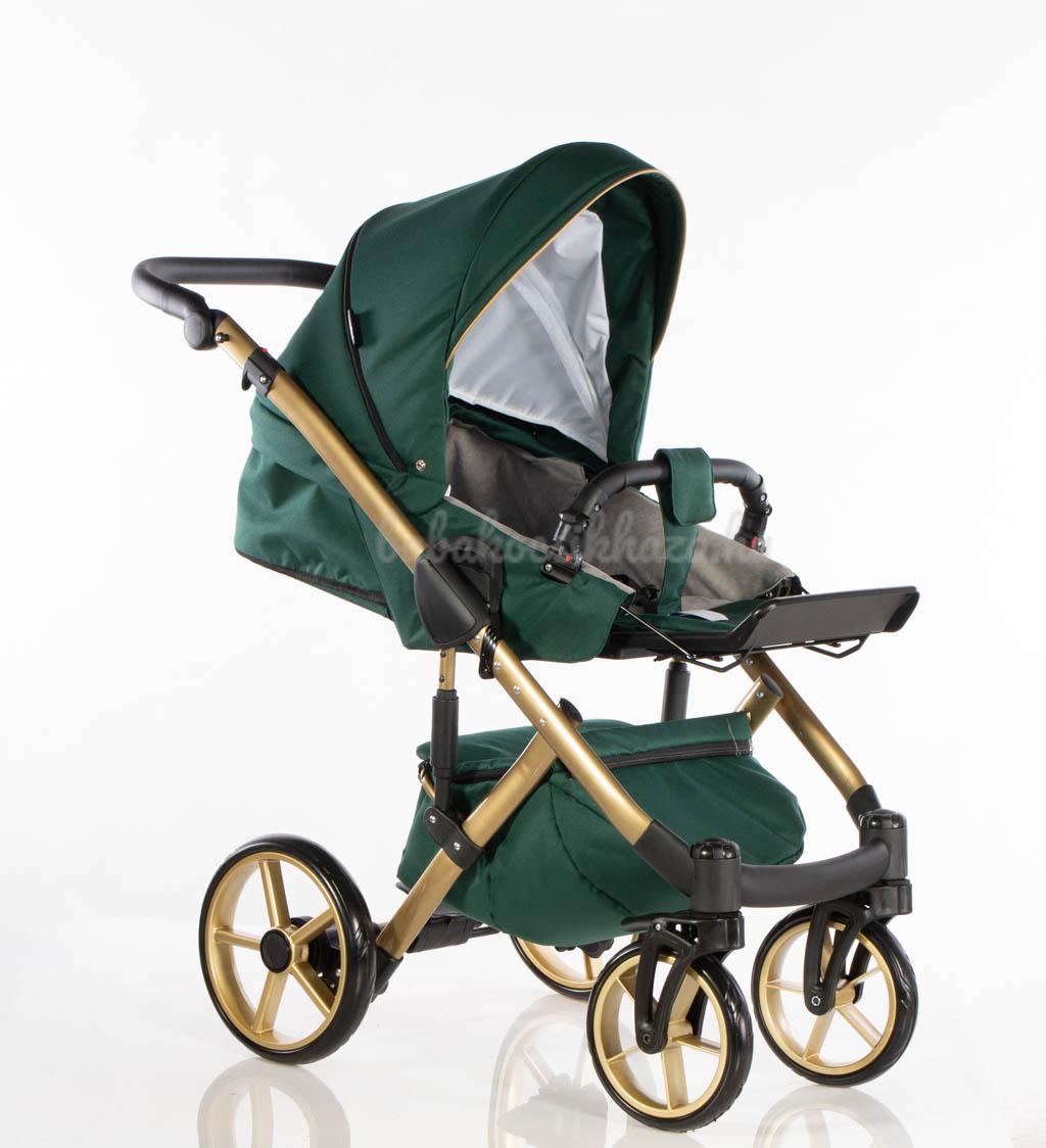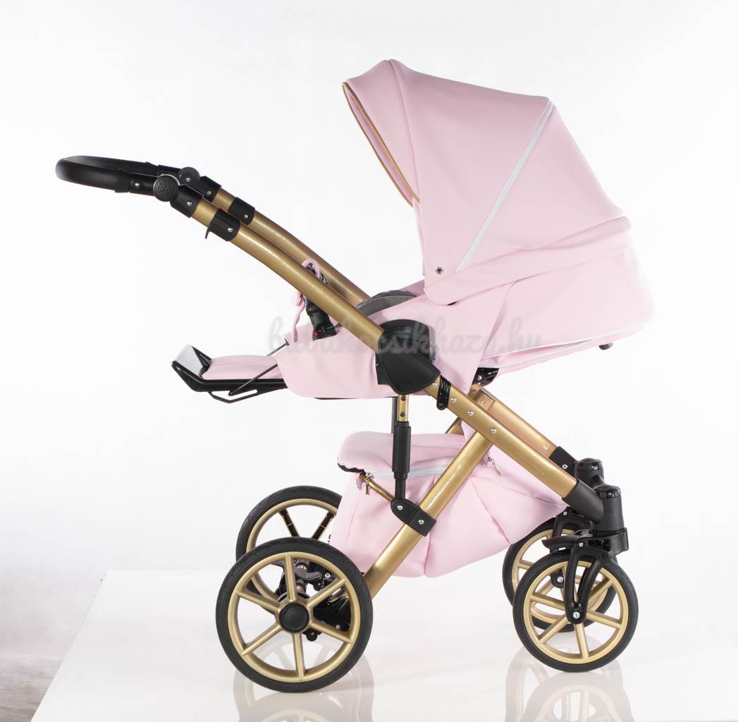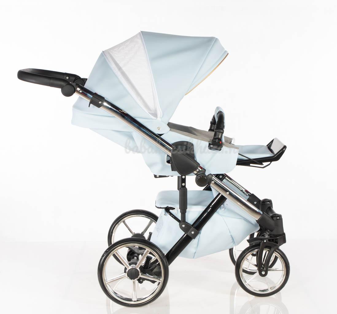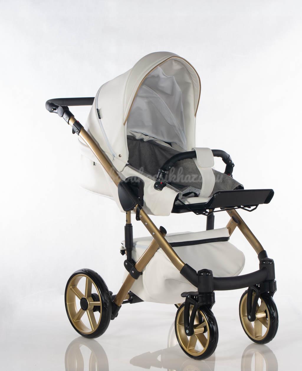 Sport rész: Puha téli-nyári kivehető mosható fekvőbetét, 5 pontos párnázott biztonsági övrendszer, nagy méretű ülő-és fekvőfelület, a háttámla 4 fokozatban vízszintesig dönthető, kiesésgátló, állítható kényelmes (bőr) lábtartó, levehető nagy méretű kupola kizippzározható szúnyoghálós szellőzővel, levehető bőr karfa, mely mindkét irányból nyitható, vastag lábzsák(súlya: 3,5kg)