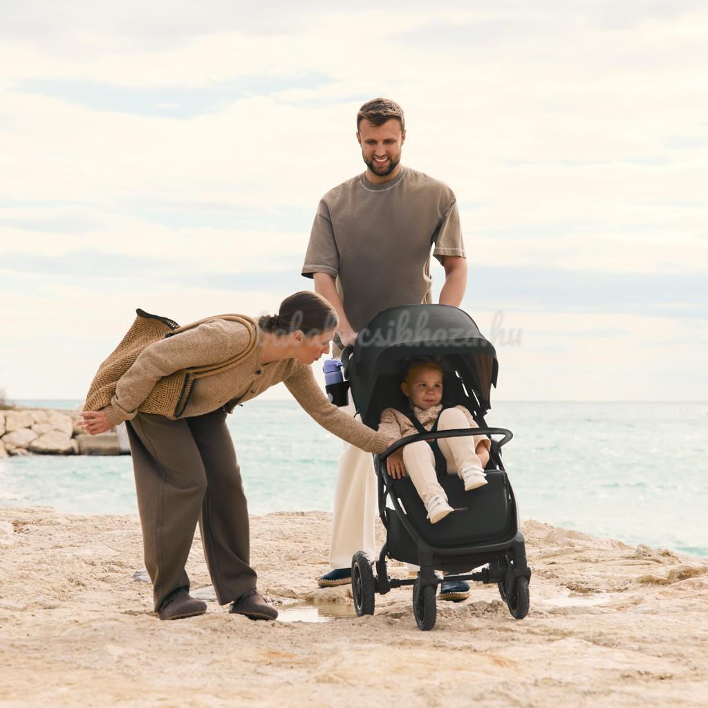 A babakocsi behúzható szúnyoghálóval, amely a lábtartóba rejthető, és praktikus pohártartóval kapható. Ideális megoldás aktív családok számára, akik közös kirándulásaik során értékelik a kényelmet, biztonságot és stílust.