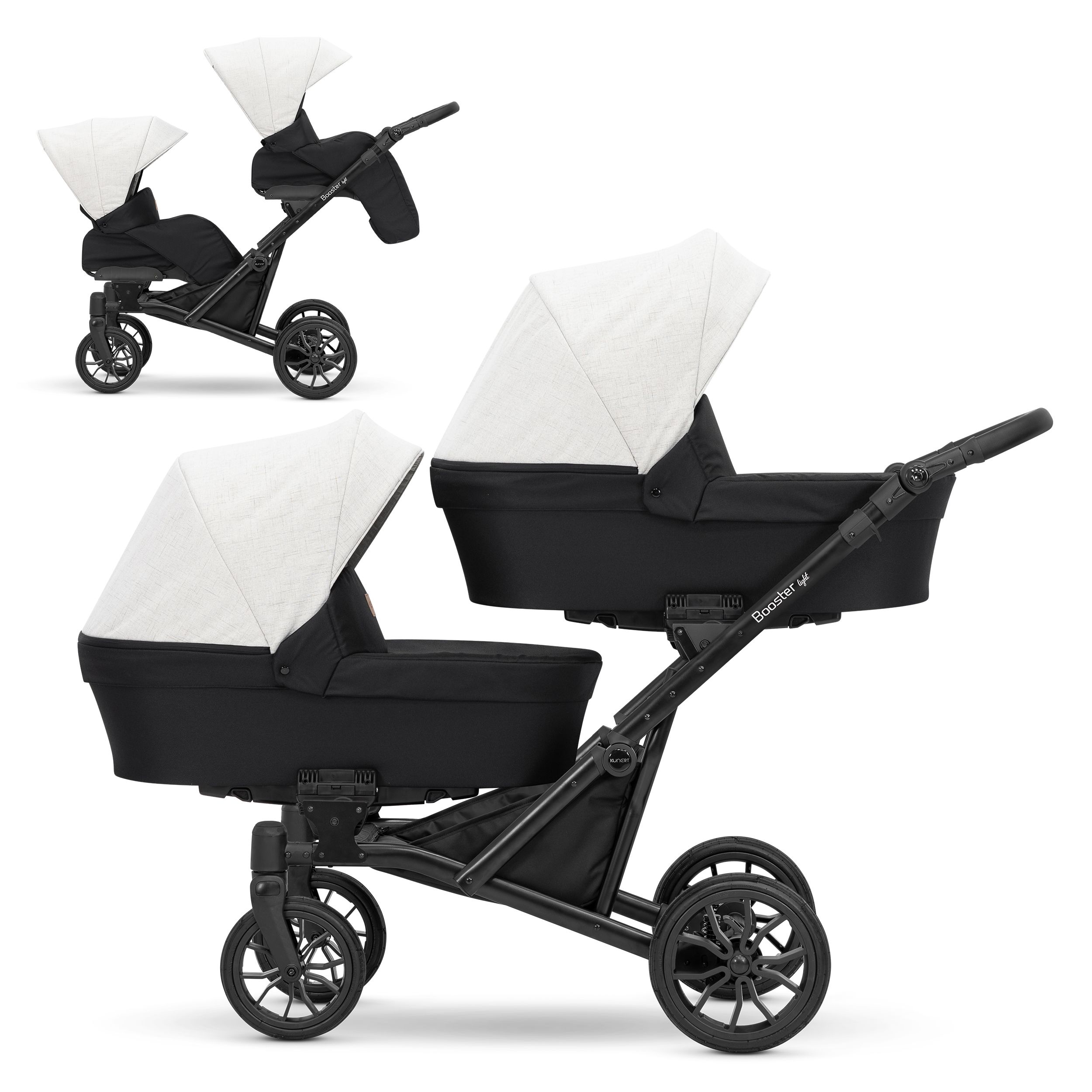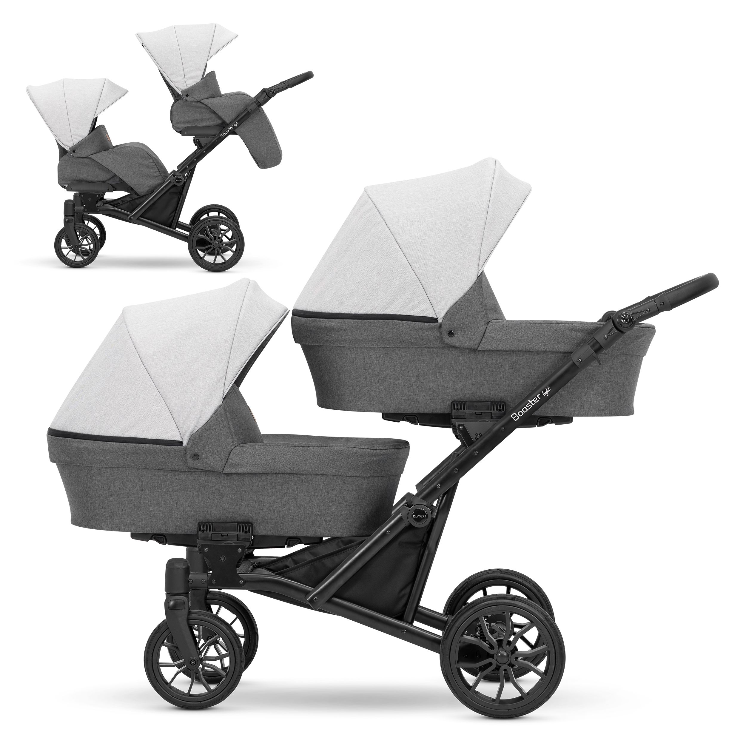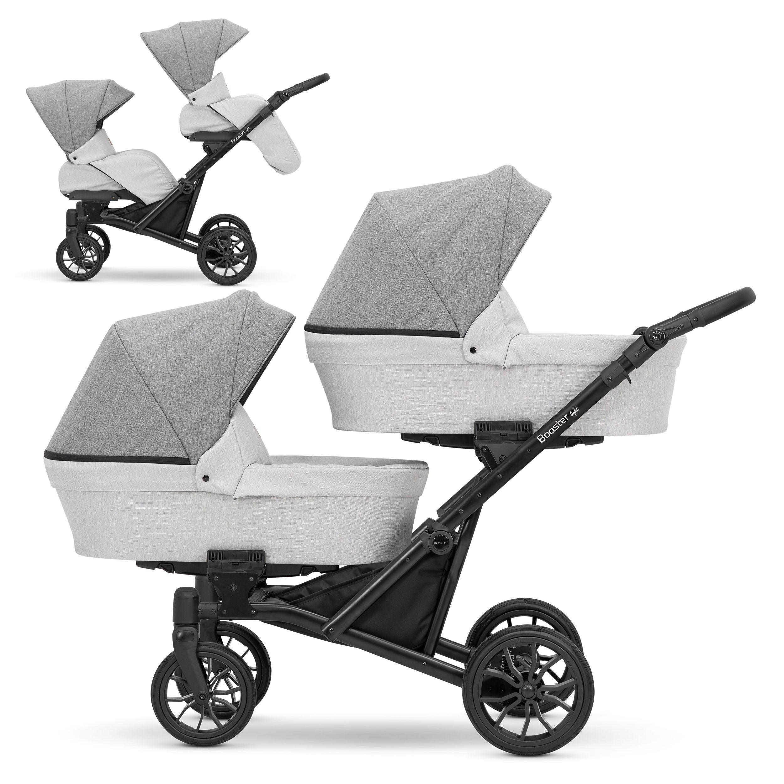 A Kunert BOOSTER multifunkciós iker- és testvérbabakocsi tökéletes választás azoknak, akik ikreket várnak, vagy olyan családoknak, ahol a testvérek rövid időn belül követik egymást. A tartozékok nem egymás melletti, hanem egymás mögötti elhelyezésének köszönhetően a babakocsival való közlekedés lényegesen egyszerűbb, hiszen széltére a babakocsi azonos méretekkel rendelkezik, mint egy klasszikus (egyszemélyes) változat. A mózeskosár, a sportrész és a hordozó mindkét irányban, egymástól függetlenül rögzíthető, így megoldható, hogy a vázra egyszerre egy mózeskosár és egy sportrész is csatlakoztatva legyen az igényeknek megfelelően. A strapabíró váznak köszönhetően minden terepviszonyhoz könnyen alkalmazkodik. Első kerekei bolygósítható és fixálható tömör gél kerekek, hátsó kerekei lengéscsillapítóval felszerelt 30 cm átmérőjű fix tömör gél kerekek. A tolókar 75-110 cm magasság között állítható. Mózeskosara rendkívül tágas és emelhető fejrésszel rendelkezik. Sport része széles ülőfelülettel kialakított, háttámlája közel vízszintes pozícióban is rögzíthető, lábtartója állítható, karfája levehető. Kupoláján hálós szellőző biztosítja a melegebb napokon is a gyermekek kényelmét. A huzat vízhatlan, ÖKO-TEX anyagból készül, amely levehető és mosható. Az alapfelszereltségek közé tartozik a pelenkázó táska, zárható bevásároló kosár, pohártartó valamint a mózeskosarakra rögzíthető 2 darab esővédő és 2 darab szúnyogháló.