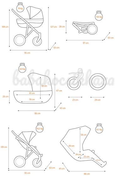 Tartozékok: 2 db Mózeskosár + 2 db Sportrész + Váz +Táska + Bevásárlókosár+ Esővédők + Szúnyoghálók