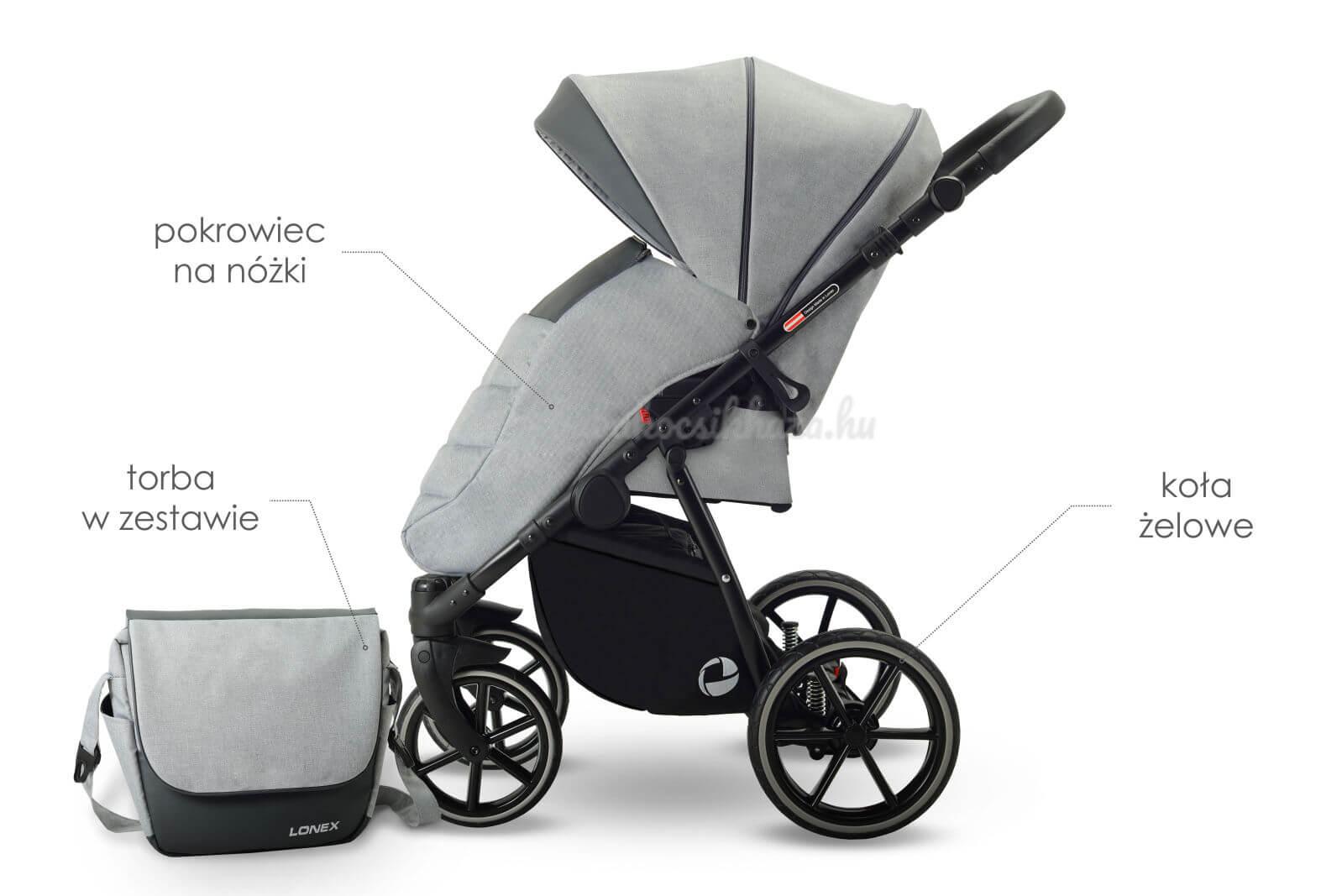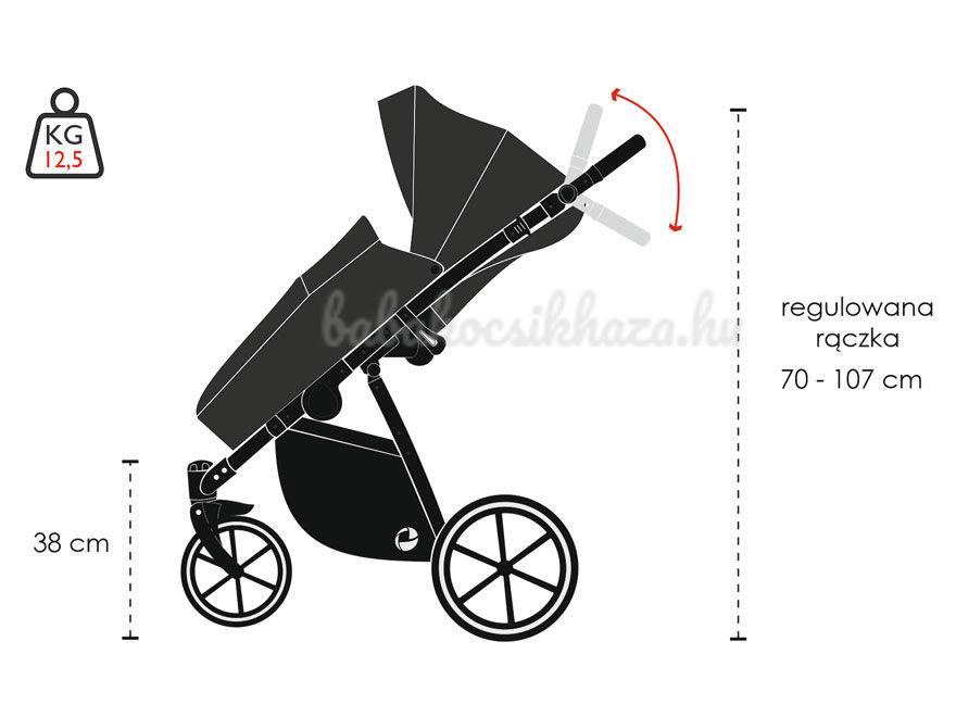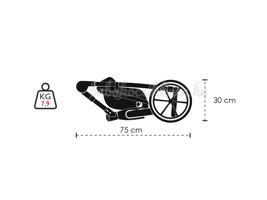 Tartozékok: tolókarra akasztható hátitáska (a babakocsi színeihez passzoló színben a kép illusztráció), pohártartó, esővédő, lábzsák.