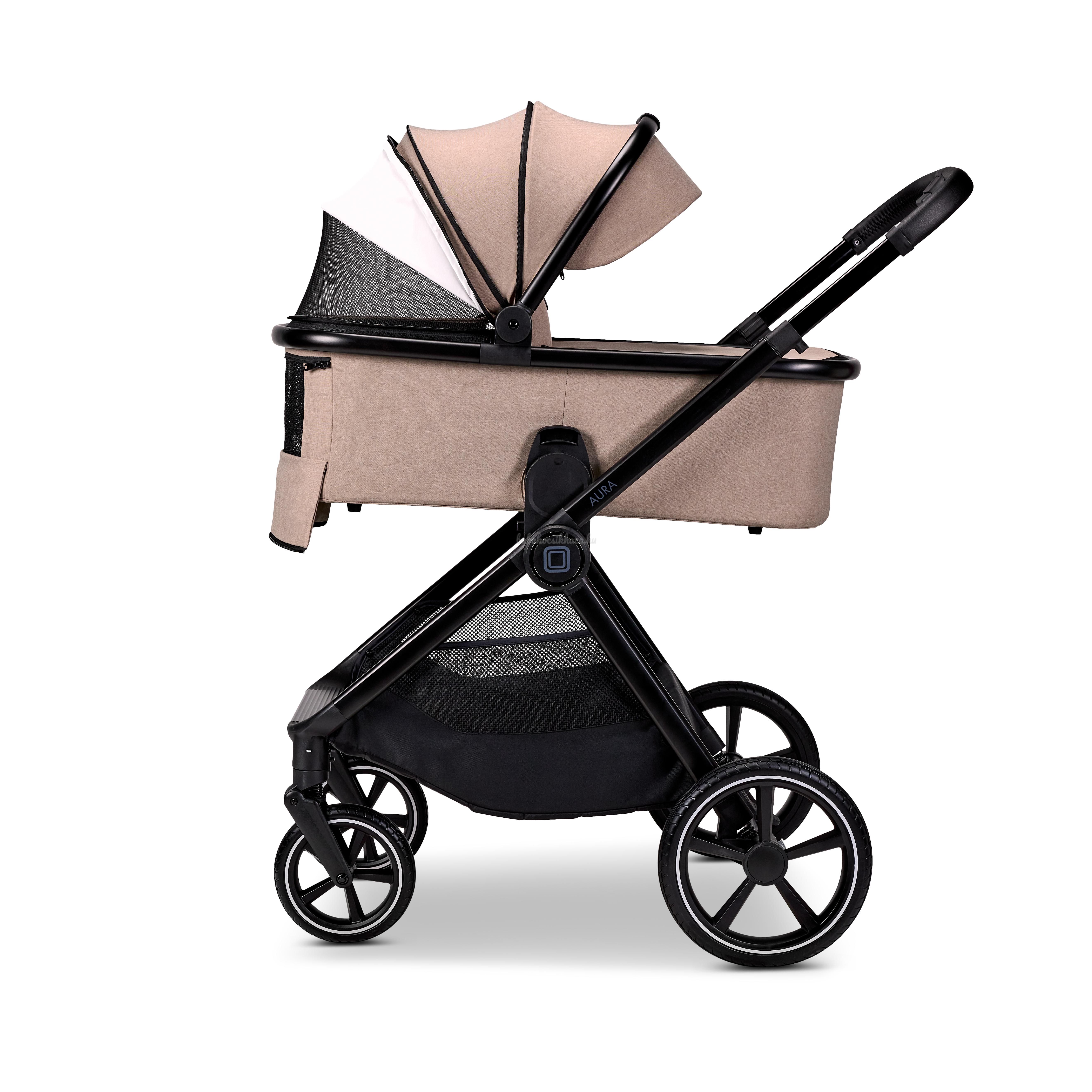 Az AURA az ideális kezdő babakocsi a babakocsik világában – letisztult formatervezésű, funkcionális funkciókkal rendelkező, és olyan fiatal családok számára készült, akik nagyra értékelik a megbízhatóságot, a stílust és a mindennapi használatra való alkalmasságot. Jól átgondolt alapfelszereltségének köszönhetően az AURA az első naptól kezdve elkíséri Önt – könnyen kezelhető és kényelmesen használható. A mellékelt magasságállító adapterek kényelmes, megemelt helyzetbe emelik a mózeskosarat, így a babát hátfájdalom nélkül be- és kiveheti. Akár napi sétáról, akár bevásárlásról van szó: a praktikus bevásárlókosár elegendő helyet kínál mindennek, amire útközben szüksége van – és diszkréten integrálódik a dizájnba. És mivel egy jó kezdéshez több kell, mint egy babakocsi, az AURA mindent tartalmaz, amire a mindennapi élethez szükséged lehet: színben illő pelenkázótáska, esővédő és a mózeskosárhoz illő magasságú adapterek – mindezt mellékelve. A nagy kerekek biztosítják a sima futást még egyenetlen felületeken is. A mellékelt magasságállító adapterek lehetővé teszik a mózeskosár kényelmes, megemelt pozícióját – még kényelmesebbé téve a baba be- és kivételét. Az egyszerű útitársad a kezdetekhez – mindennel, ami számít.