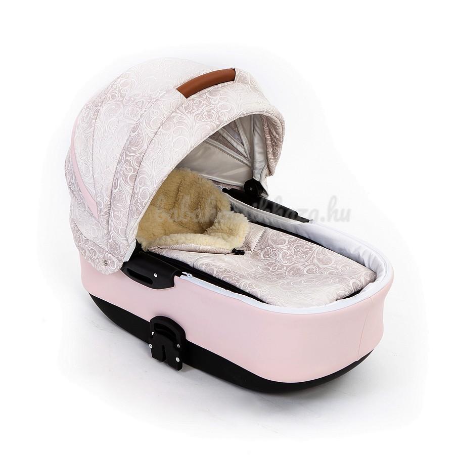 Babahordozó: 0-10kg-ig (kb.1éves korig) használható, adapter segítségével egy mozdulattal rögzíthető a babakocsi vázszerkezetére, jó oldal- és fejvédelem, kivehető frottír újszülött szűkítőbetét és deréktámasz, kupola, 3 pontos párnázott biztonsági övrendszer központi övfeszítővel, vastag lábzsák (súlya: 2,5kg)