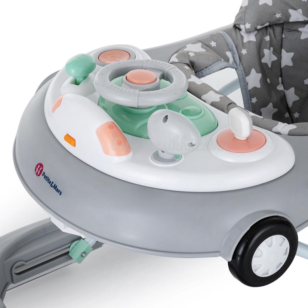A Petite&Mars Cabrio bébikomp segít gyermekének, aki járni tanul és felfedezi a világot, a stabilitás és a biztonságos tájékozódás megőrzésével. A bébikomp része egy zenei panel, amely fejleszti a gyermek hallását, tapintását és motorikus képességeit, felébreszti a képzeletét és az érzékszervi érzékelését. A bébikomp teljesen összecsukható, hogy a lehető legkönnyebben tárolható legyen. A váz egy biztosítékkal van felszerelve, amely megvédi a bébikompot a véletlen összecsukódástól. A kerekek csökkentik a rázkódásokat, ugyanakkor megállítják a bébikompot, ha a súlypont a hátsó kerekekre kerül. Főbb előnyei: