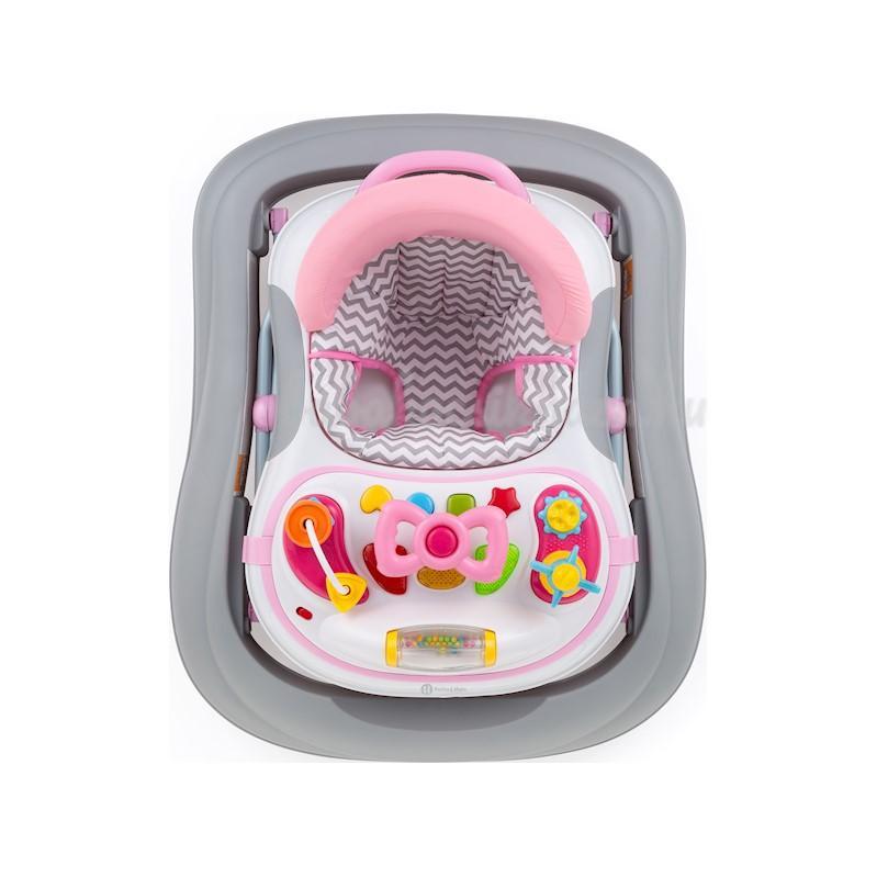 Járásra ösztönzi a gyermeket. Tartalmazza a kormánykerékkel ellátott zenei panelt, különféle hangokkal és fényekkel. A panel eltávolítható, és külön játékként szolgál. 3 pozícióban állítható ülésmagasság, a gyermek igényeinek megfelelően, biztosítva a gyermek lábának érintkezését a padlóval. Megerősített háttámla a hát megfelelő megtámasztásához. Az ülést praktikus fogantyú egészíti ki. Eltávolítható, mosógépben mosható huzat. Biztosíték a véletlen összecsukódás ellen. Speciális fékrendszer, az esetleges balesetek elkerülése érdekében. Minősített és biztonságos anyagokból készült. 6 hónapos kortól 12 kg-ig ajánlott. Szilikon kerekek. A bébikompba csak olyan gyereket helyezzen, aki már önállóan tud ülni, ill. állni. Javasoljuk, hogy a babát csak korlátozott ideig, legfeljebb 20 percig helyezze a bébikompba.
