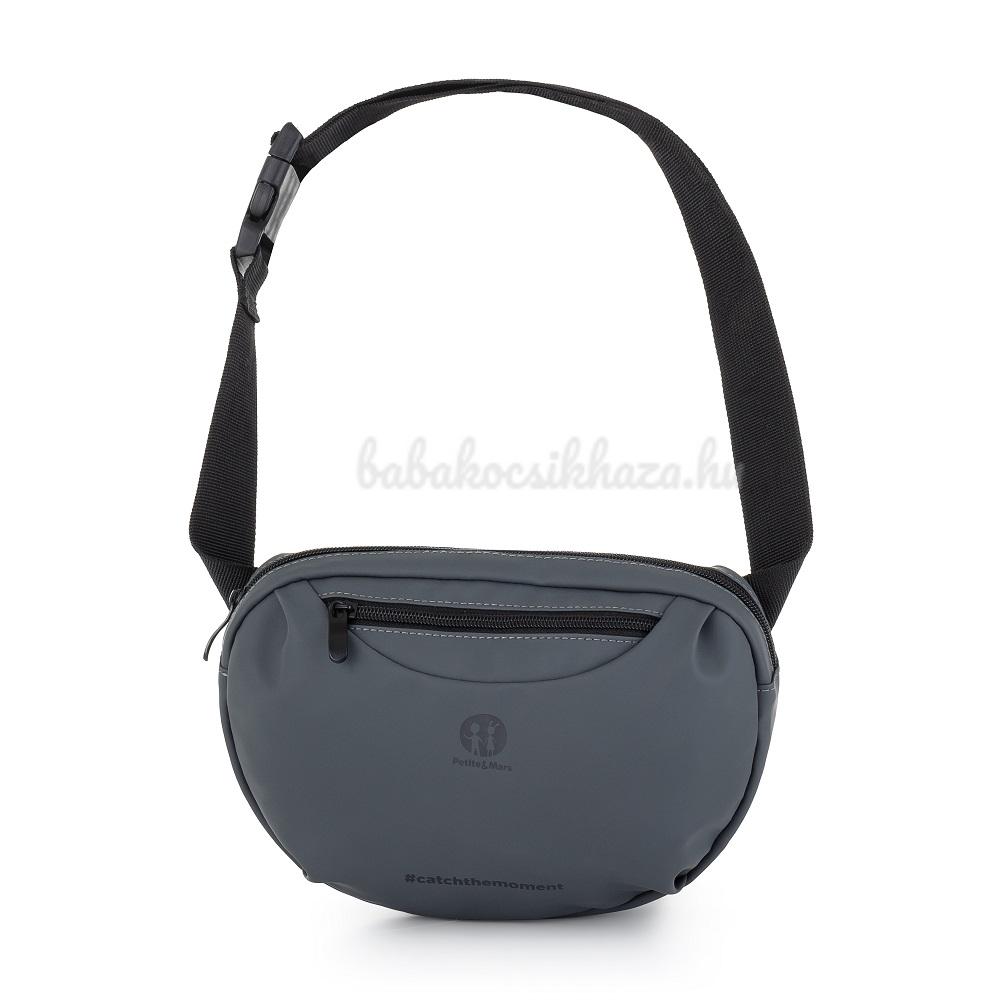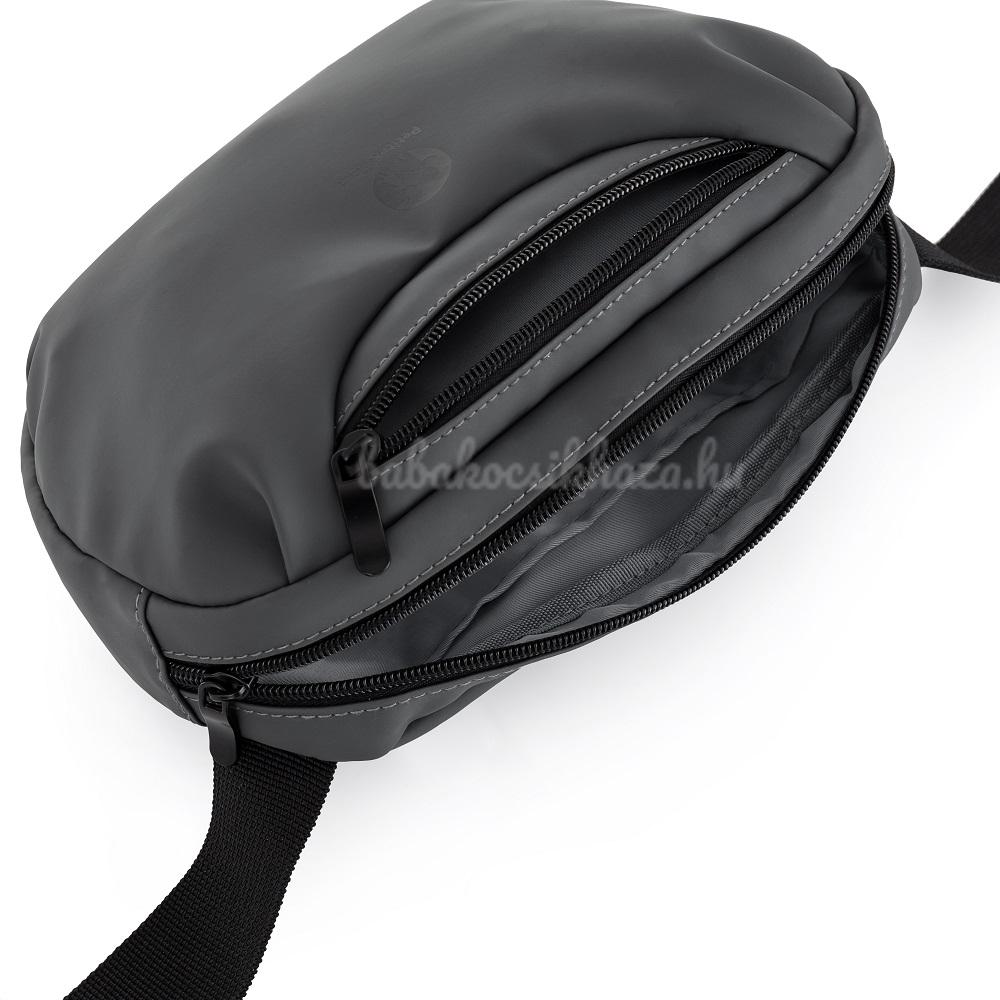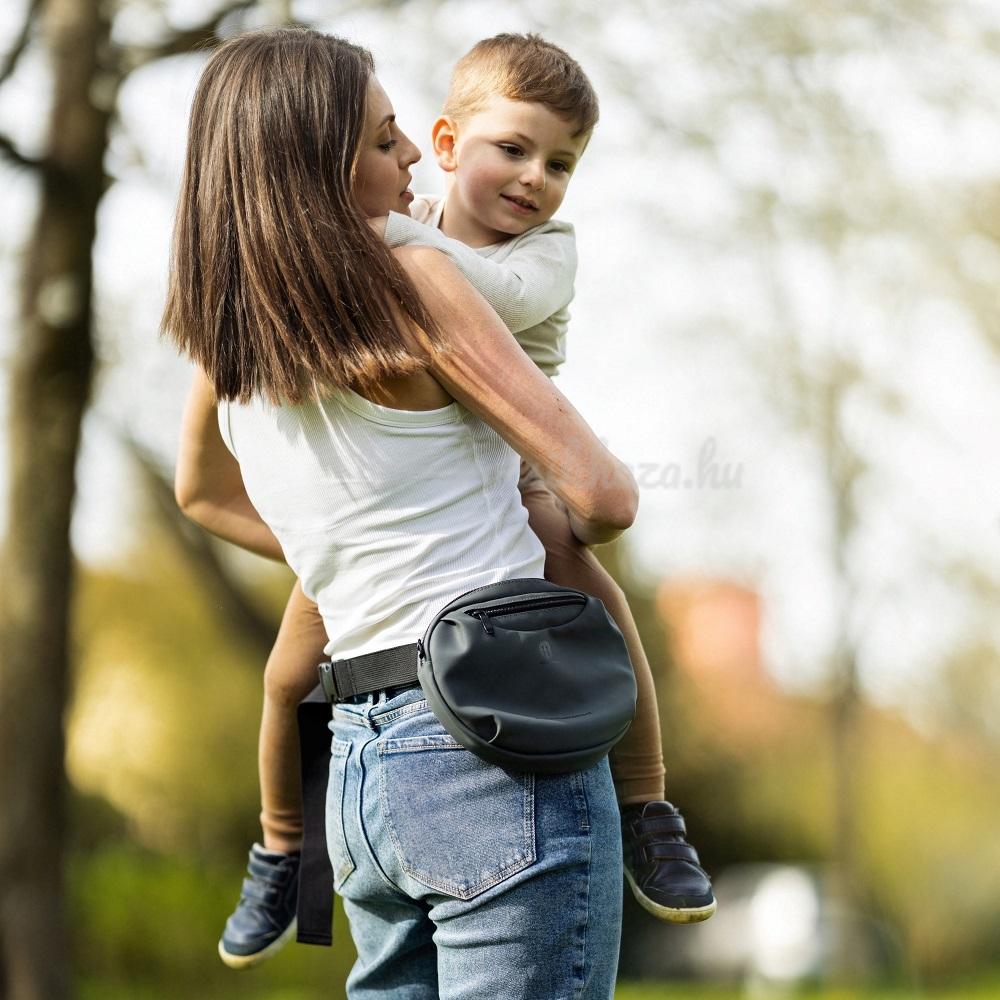 Kiváló minőségű, nedvességálló anyagokból készült. Egy széles rekesszel rendelkezik, amelyben elférnek az olyan alapvető dolgok, mint az okostelefon vagy a pénztárca, valamint 2 kisebb zsebbel, köztük egy külső zsebbel. A hosszú, állítható pántnak köszönhetően viselheti csípőjén klasszikus övtáskaként, vállon átvetve messenger táskaként vagy a babakocsihoz rögzítheti.