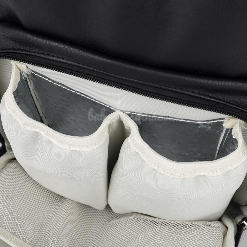 A tágas fő rekesz, amely kétirányú cipzárral záródik, szélesre nyílik, hogy könnyen hozzáférhessen minden szükséges dologhoz. A hátizsák tizenkét funkcionális zsebbel rendelkezik, beleértve a tabletek vagy nedves törlőkendők számára fenntartott zsebet, szigetelt zsebeket, vízálló zsebet a nedves dolgok számára, valamint helyet a palackoknak és kulcsoknak.