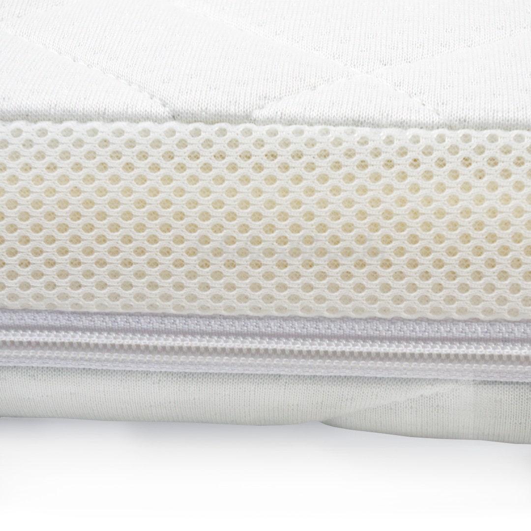 35 kg/m3 sűrűségű poliuretánból készült, ami kiváló minőségűvé, kényelmessé és könnyen kezelhetővé teszi a matracot. A kiságyrács szellőzőnyílásaival együttműködve a levegő tökéletesen kering, ami biztosítja a matrac hosszabb élettartamát és higiéniáját. A levehető ALOE VERA huzat támogatja a matrac antiallergén és antibakteriális tulajdonságait. Maga a habszivacs matrac továbbra is sztreccs pamut huzatban van, ami jelentősen megkönnyíti a felső ALOE VERA huzat felhelyezését. A matrachuzat oldalán rács található, amely biztosítja a matrac extra légáteresztő képességét.