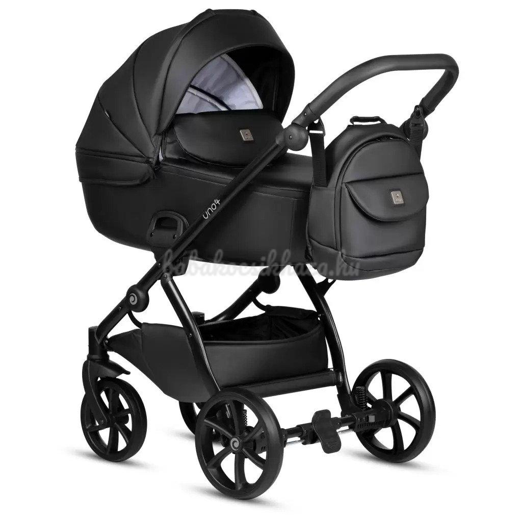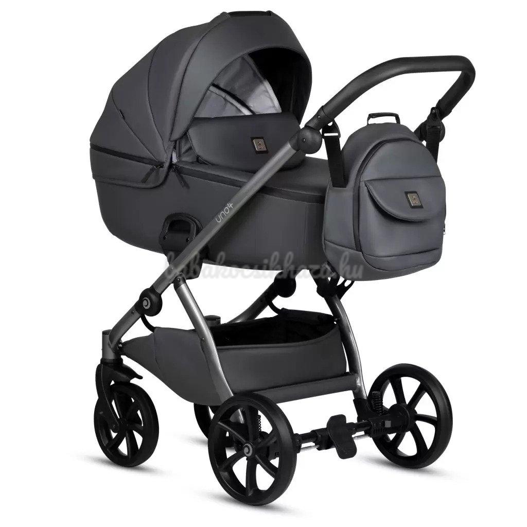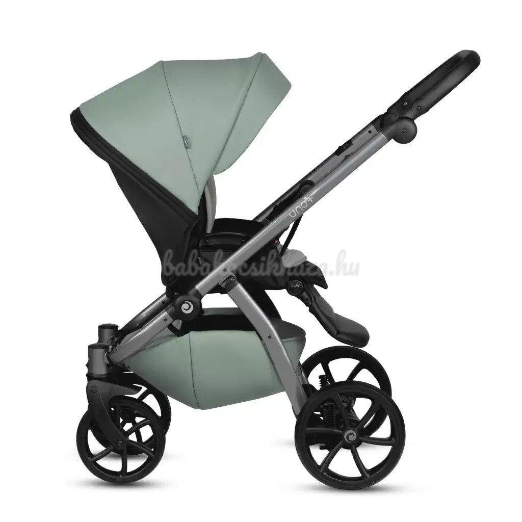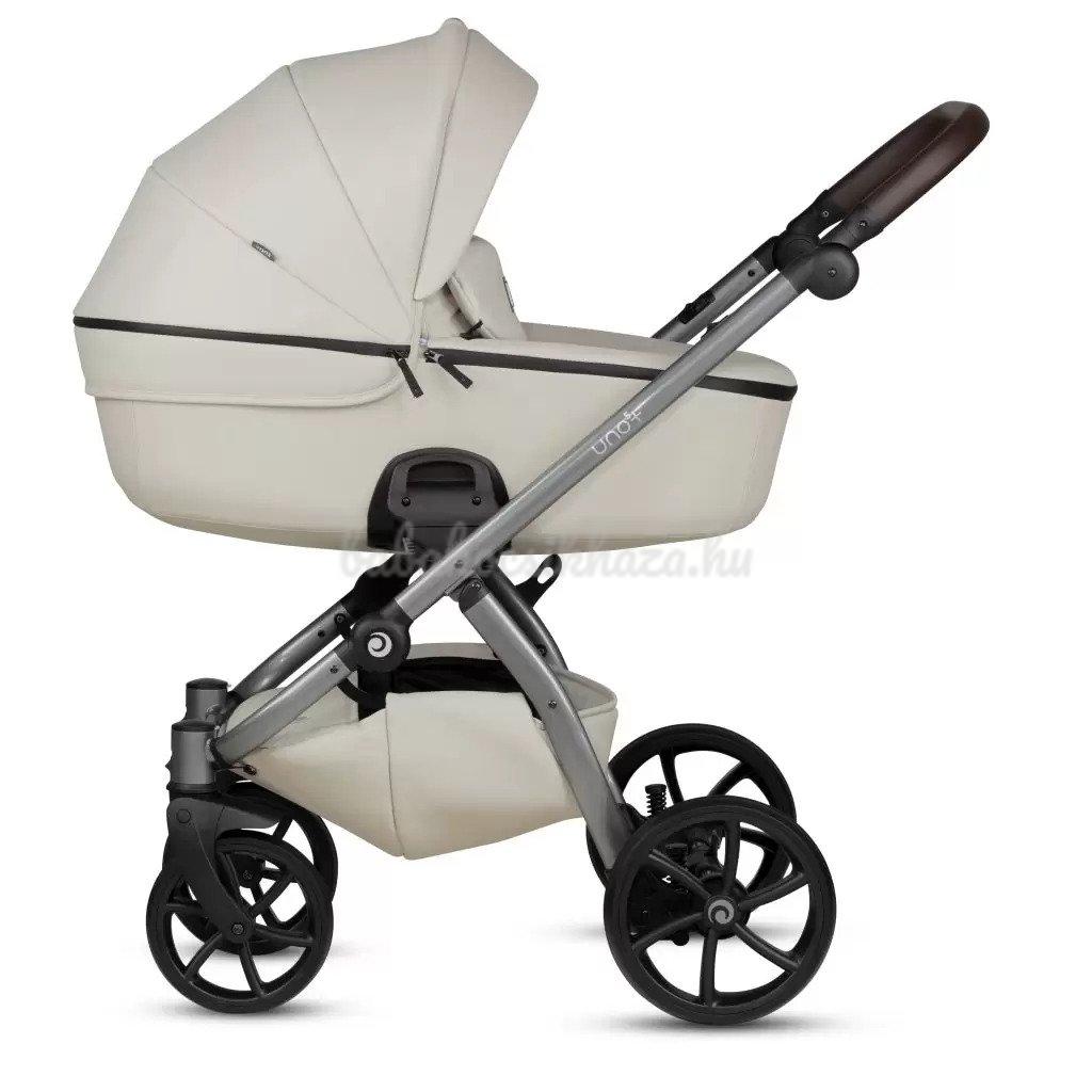 A babakocsi részletei nagyszerűen harmonizálnak egymással: ezüst felülettel ellátott váz, valamint pazar és tartós ökobőr részletek biztosítják a babakocsi lenyűgöző megjelenését. Az UNO kollekció a csillogó ökobőr részletek és a textilszövet figyelemre méltó harmonikus kombinációja teszi különlegessé