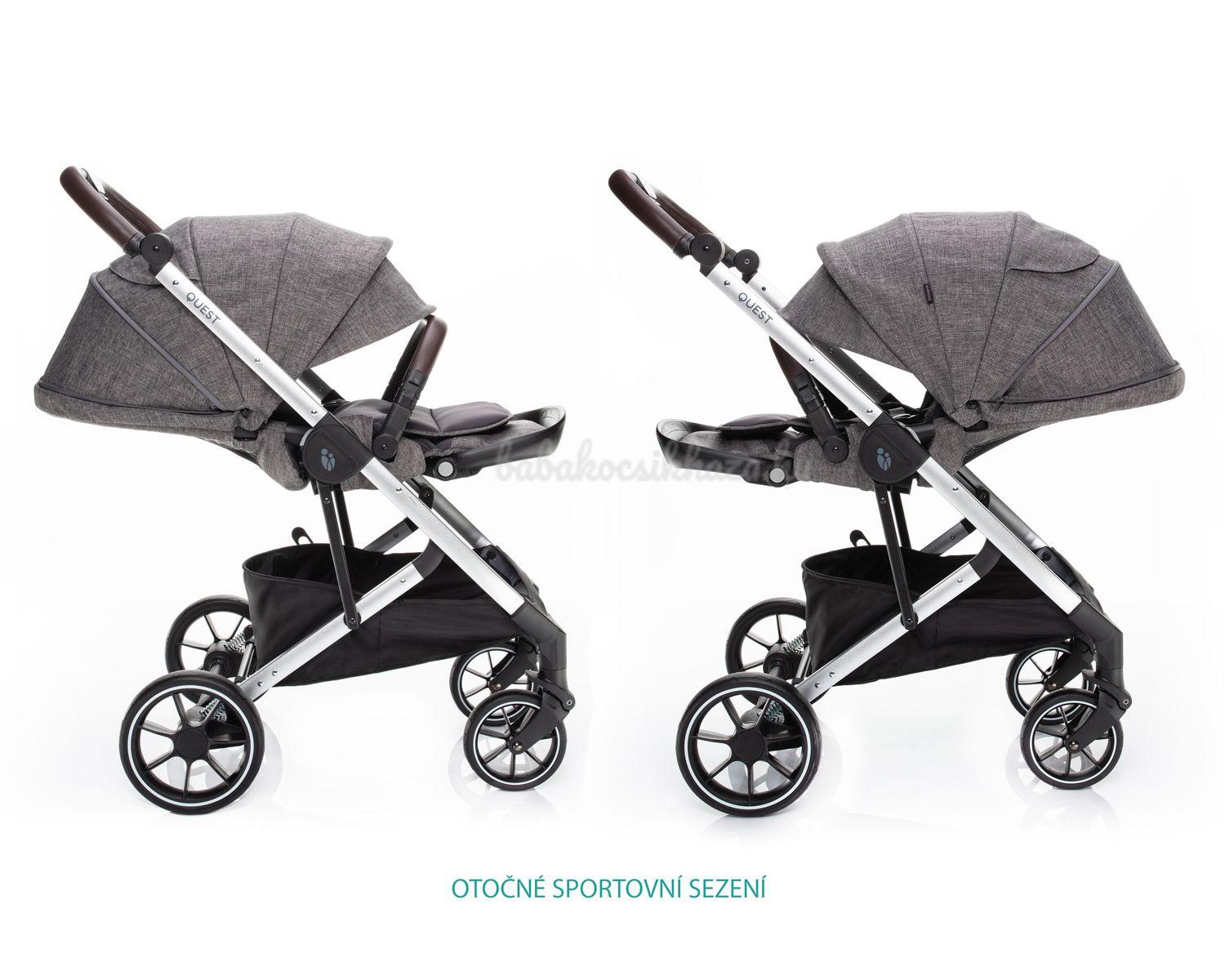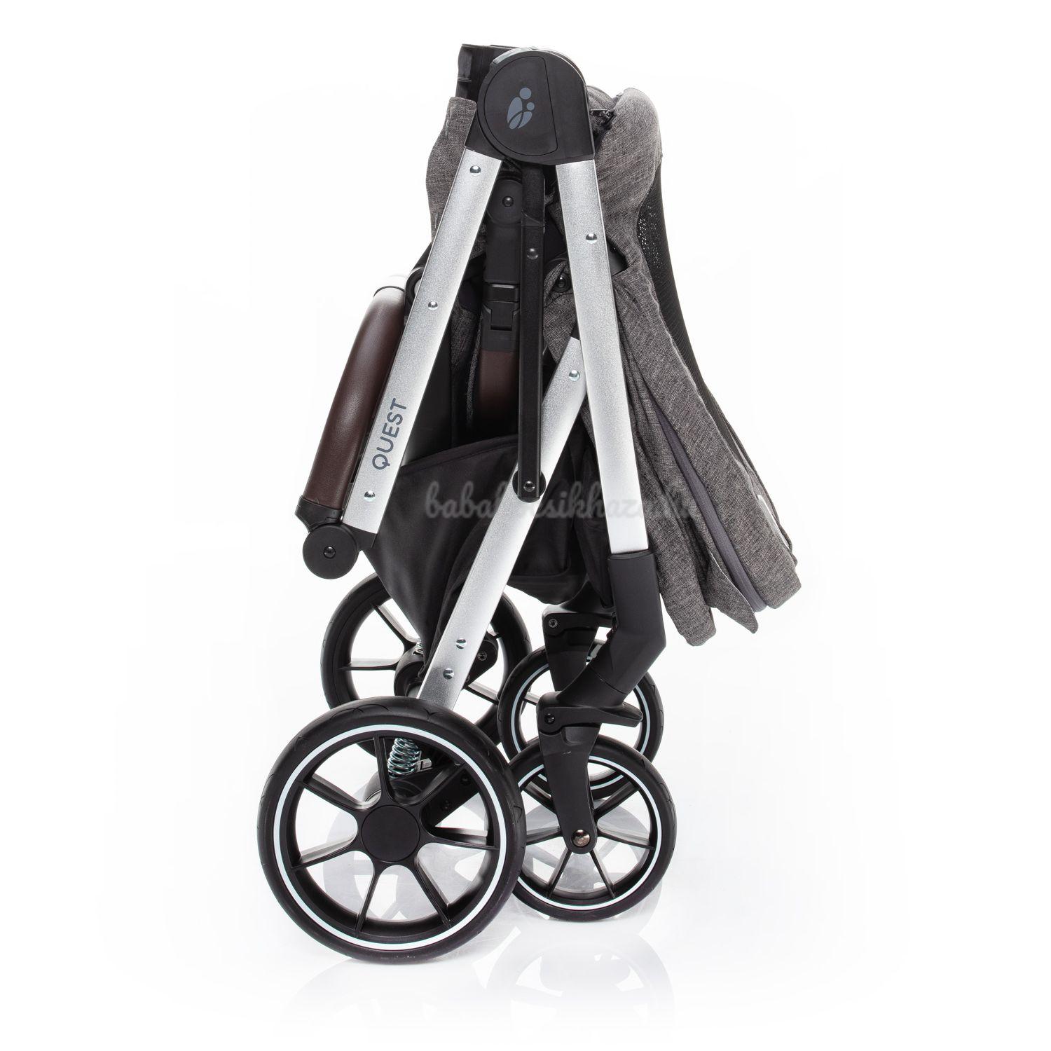 A QUEST babakocsi virtuóz irányítását és könnyű kezelését nemcsak a kiváló minőségű futómű és a kellően nagy gumikerekek, hanem az állítható magasságú fogantyú és az első reteszelésű első kerekek is biztosítják. Míg mindkét hátsó kerek egyidejűleg fékezhető a központi vezérlésű fékkel. Ez megakadályozza, hogy a babakocsi akaratlanul elinduljon. Ezenkívül a fékpedált csak felülről lehet lenyomni. Ez nem károsítja a cipőt.