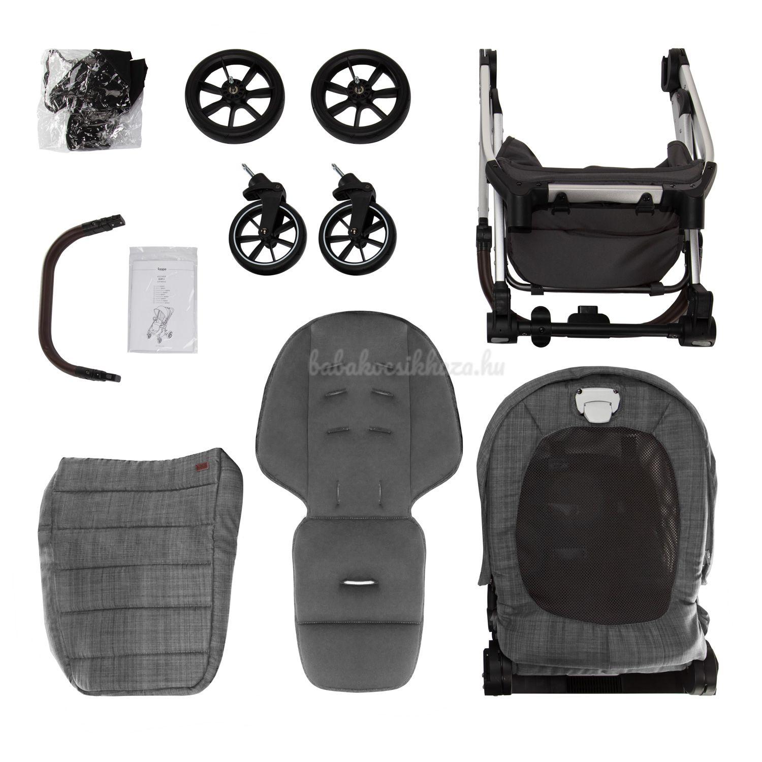 A babakocsi másik elengedhetetlen része egy tágas, legfeljebb 5 kg űrtartalmú kosár, amely lehetővé teszi, hogy minden fontos dolog mindig magánál legyen. A babakocsi tartalmaz egy esőkabátot és egy bakancsot is.