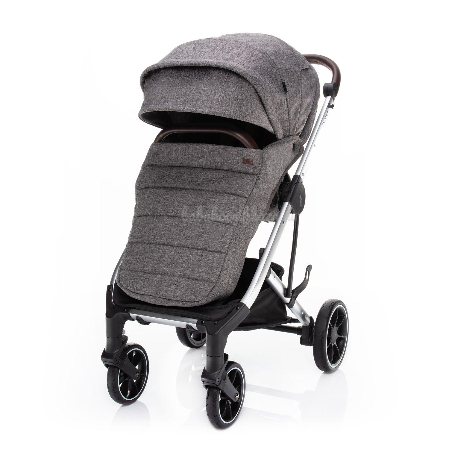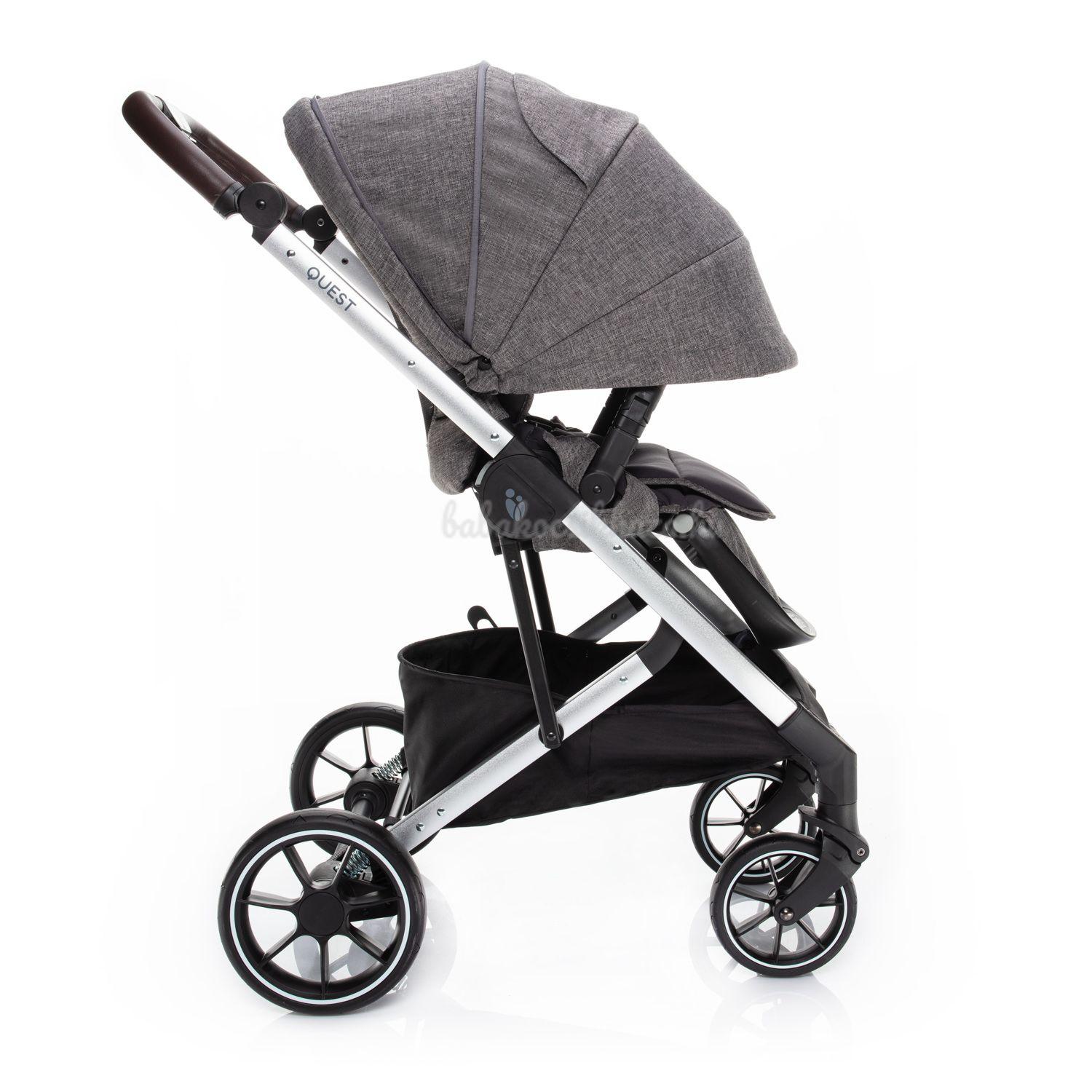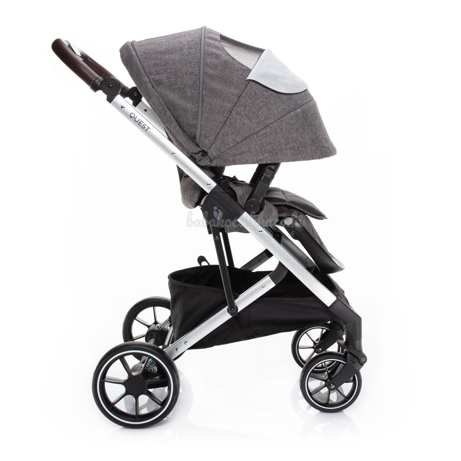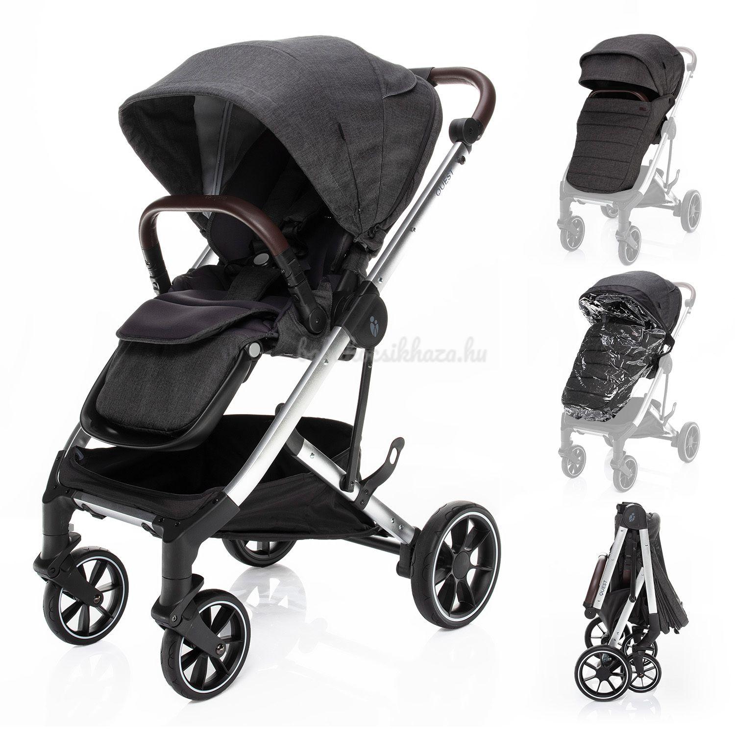 A QUEST babakocsi virtuóz irányítását és könnyű kezelését nemcsak a kiváló minőségű futómű és a kellően nagy gumikerekek, hanem az állítható magasságú fogantyú és az első reteszelésű első kerekek is biztosítják. Míg mindkét hátsó kerek egyidejűleg fékezhető a központi vezérlésű fékkel. Ez megakadályozza, hogy a babakocsi akaratlanul elinduljon. Ezenkívül a fékpedált csak felülről lehet lenyomni. Ez nem károsítja a cipőt.