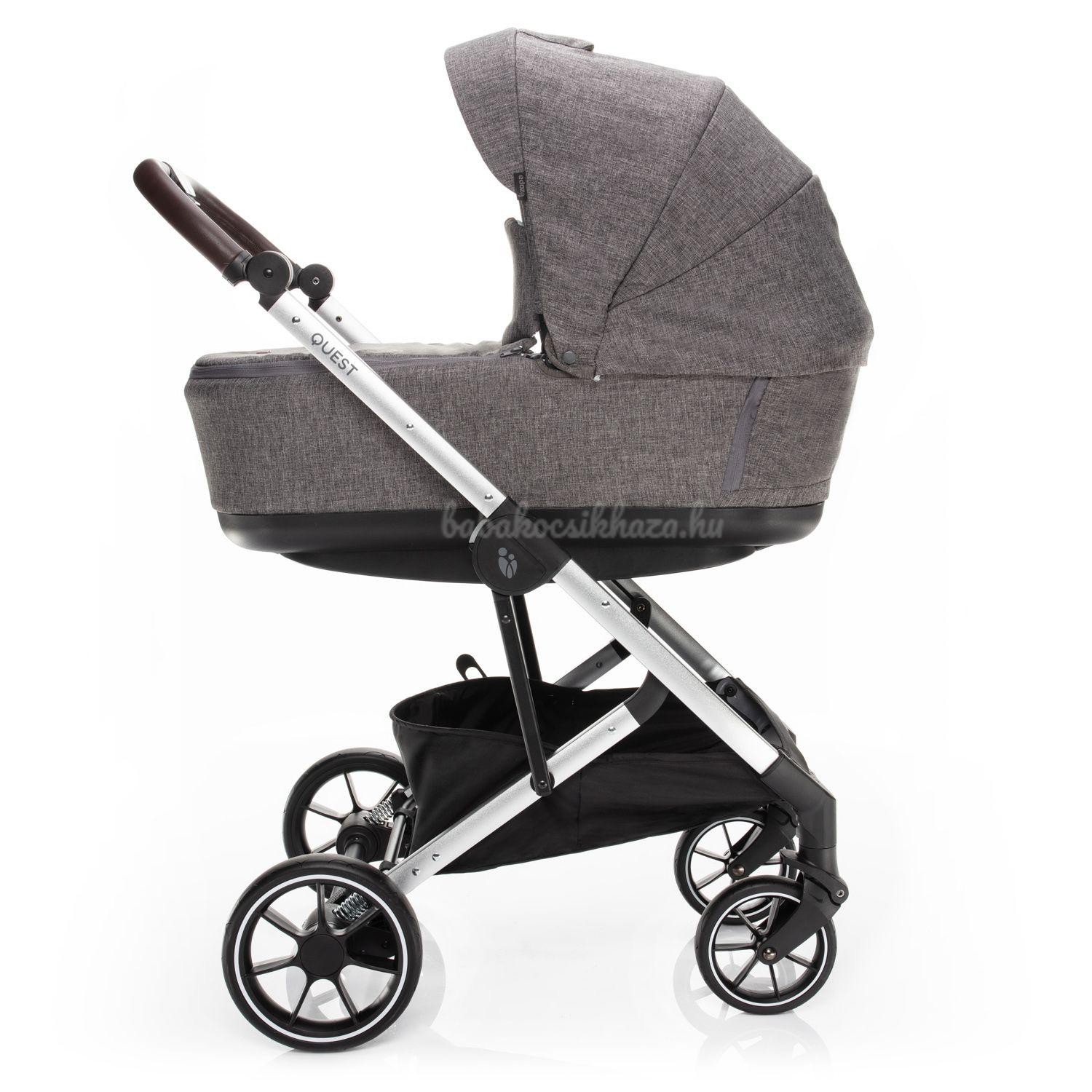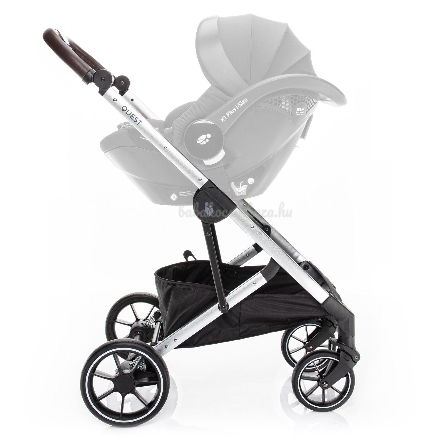 A QUEST babakocsi másik újdonsága, hogy a biztosítékon keresztül könnyedén beállíthatja a fogantyú magasságát. A kényelmes és zavartalan vezetést még nehezebb terepen is garantálja a mind a 4 gumikerék felfüggesztése egy új kivitelben. Ezek ugyanolyan puhák, mint felfújhatók, de karbantartást sem igényelnek. Tehát nincs veszély, hogy átszúrja őket. A QUEST babakocsival történő kényelmes utazást nemcsak a kiváló minőségű futómű biztosítja, hanem a megfelelő kerékméret is. Ezért van a babakocsiban 7 hüvelyk átmérőjű első kerekek és 9 hüvelykes hátsó kerekek.